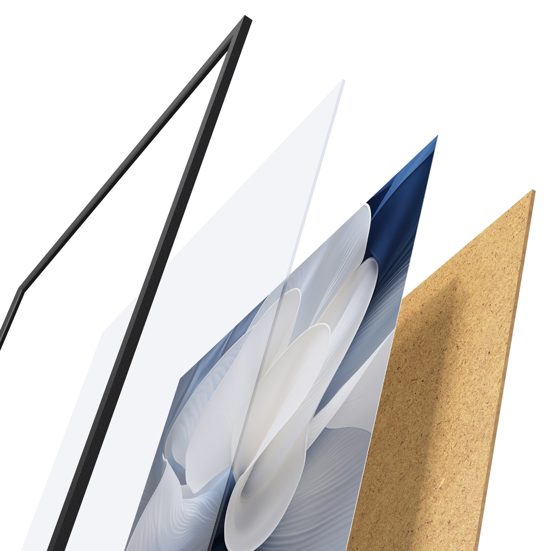 Das Poster besteht aus einem Rahmen, Plexiglas, einem gedruckten Bild und einer Rückwand aus Spanplatten. Dank der Halterungen auf der Rückseite kann das Poster sofort an die Wand gehängt werden.