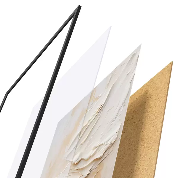 Das Poster besteht aus einem Rahmen, Plexiglas, einem gedruckten Bild und einer Rückwand aus Spanplatten. Dank der Halterungen auf der Rückseite kann das Poster sofort an die Wand gehängt werden.