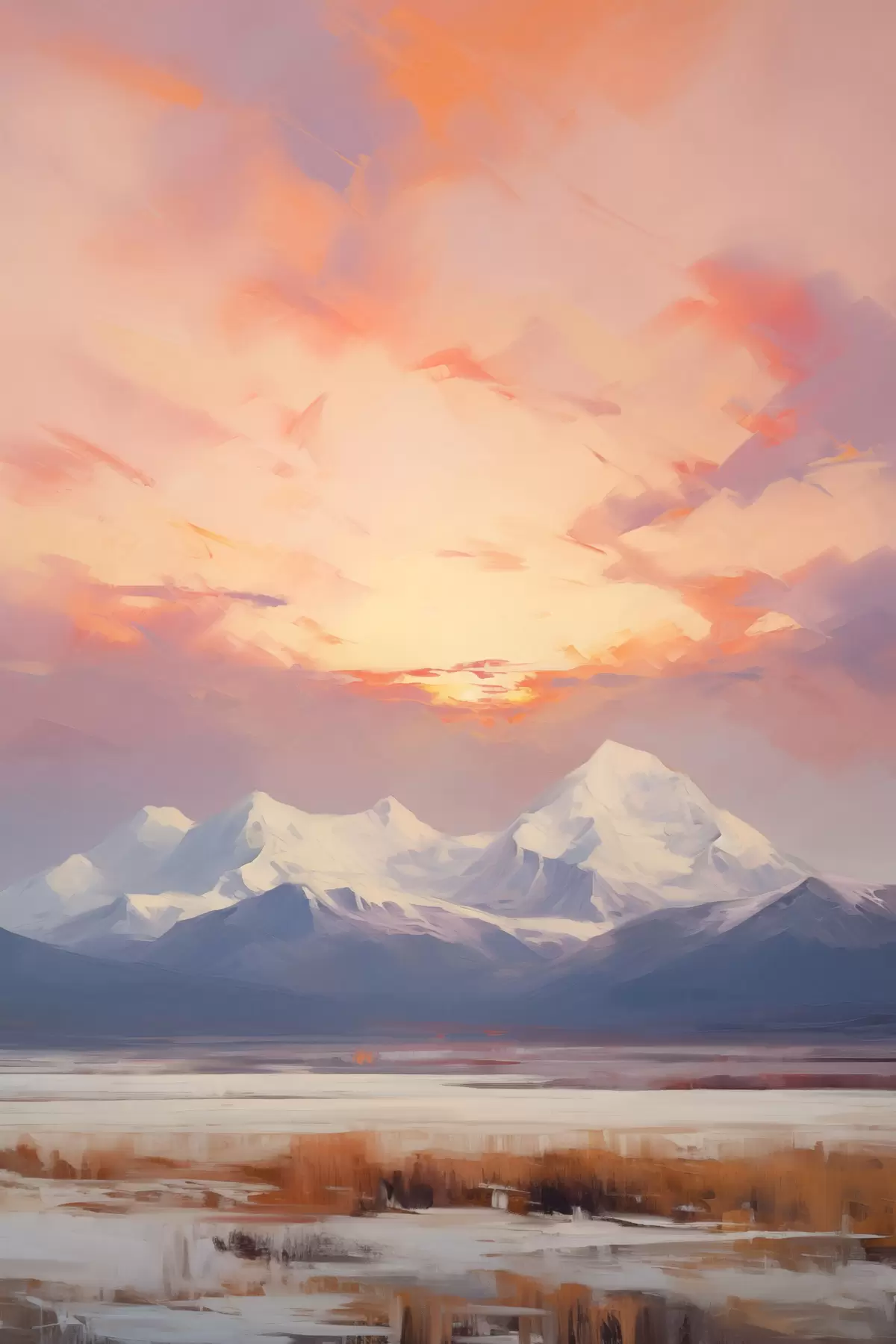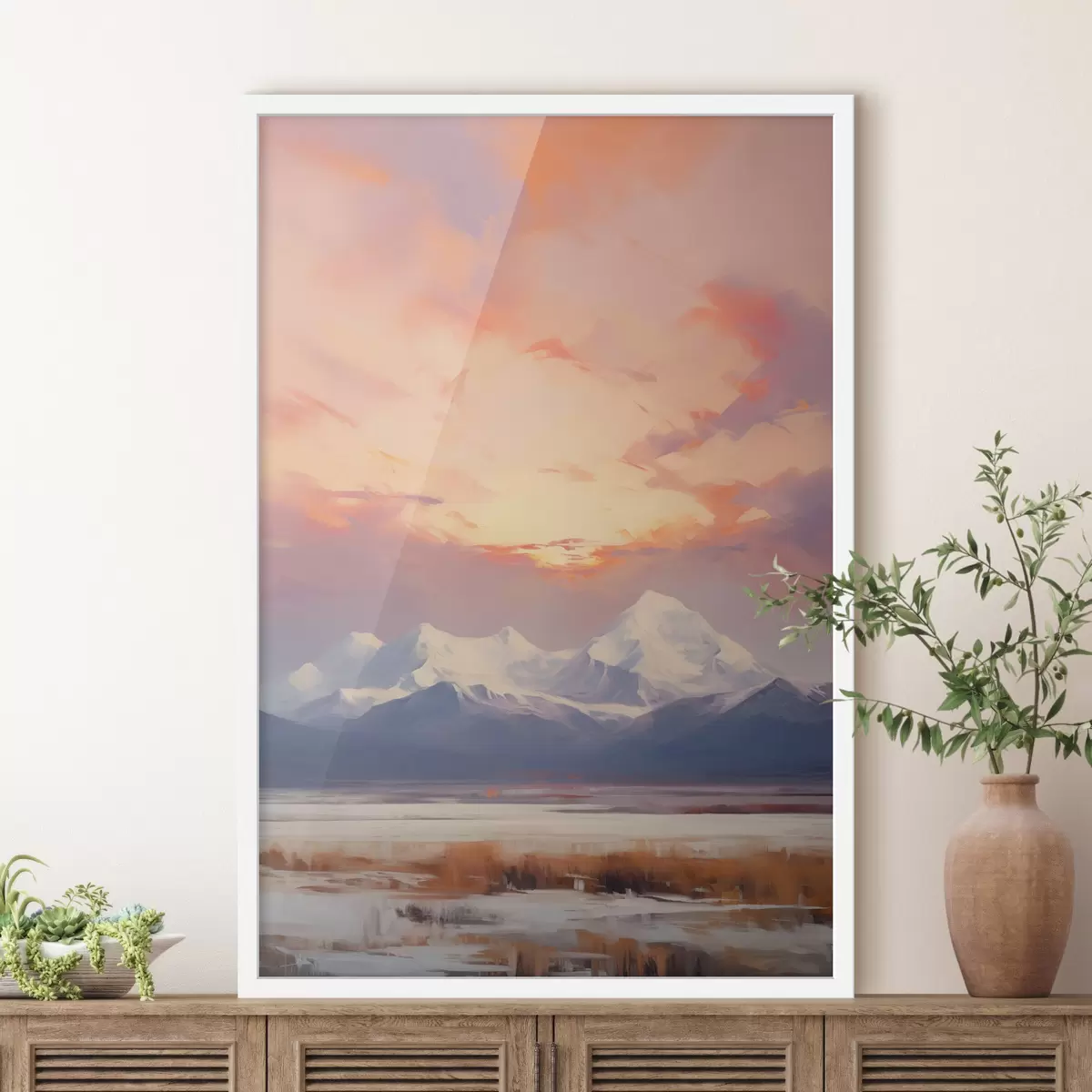 Poster Schneebedeckte Berge unter einem leuchtend orange-rosa Himmel mit Wolken Nr f48742