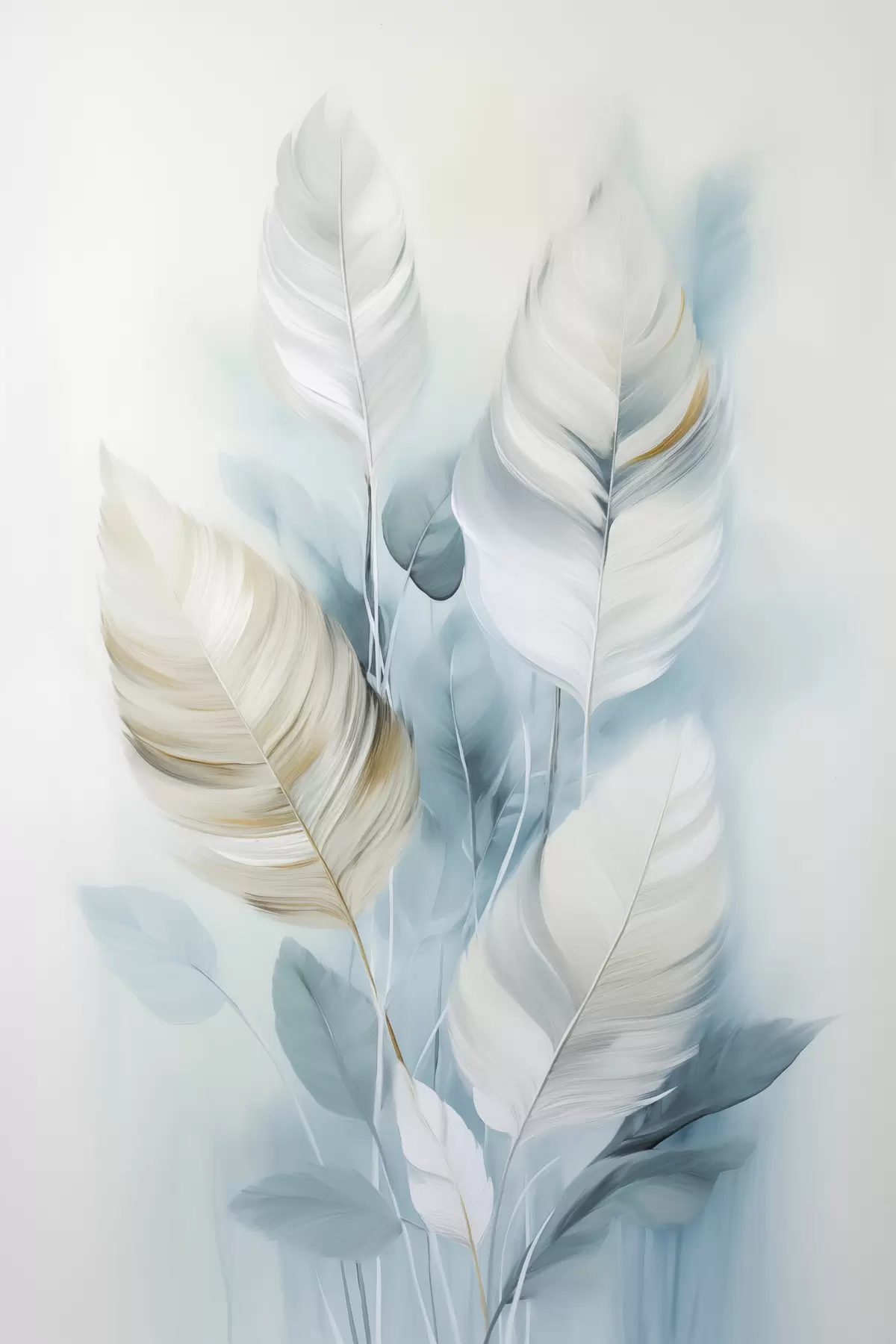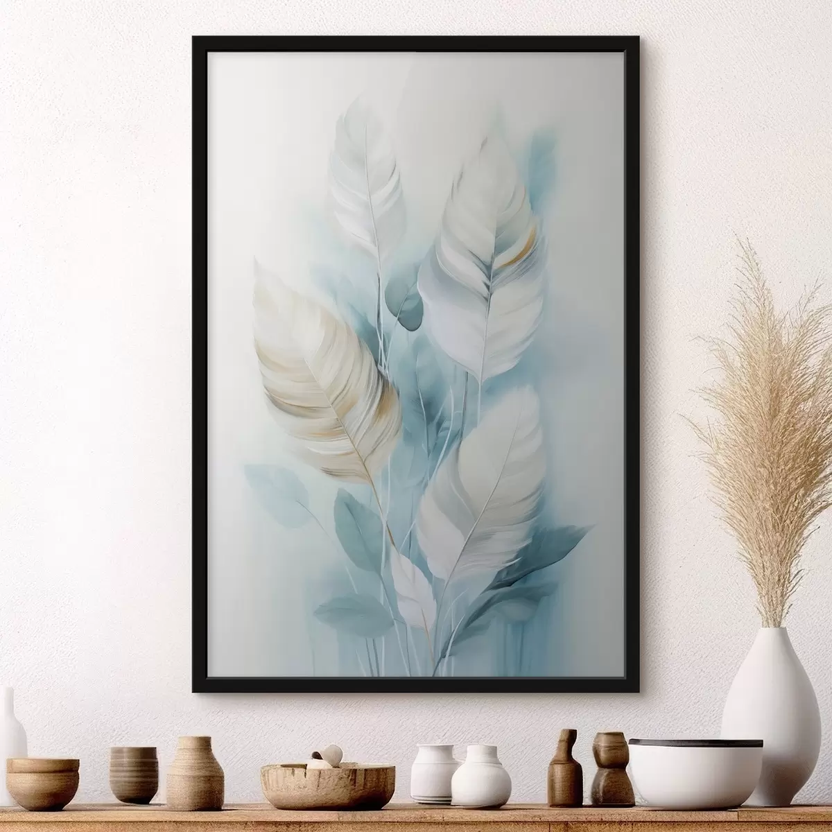 Poster Große, weiche Federn in Blau- und Weißtönen mit zarten beigen Blättern Nr f48750
