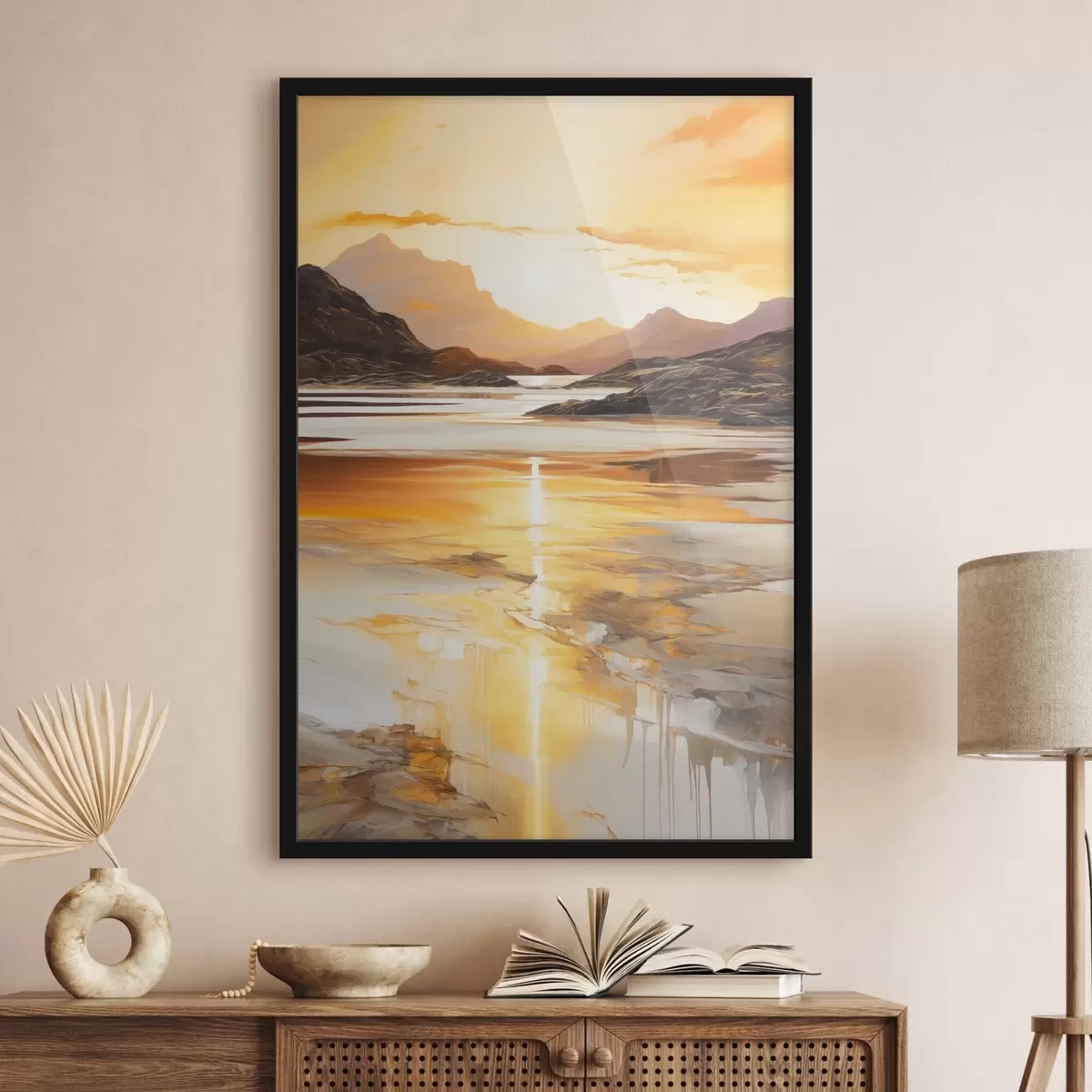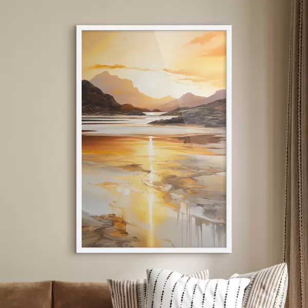 Poster Eine Landschaft mit einem Fluss und Bergen unter einem warmen orangefarbenen Himmel, Sonnenuntergang Nr f48755