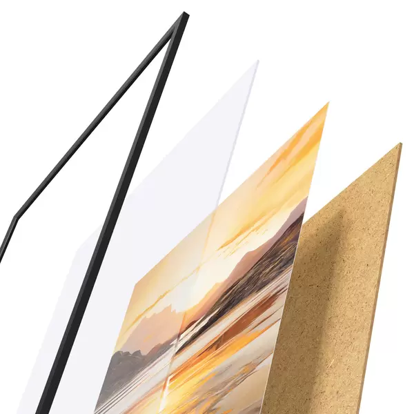 Das Poster besteht aus einem Rahmen, Plexiglas, einem gedruckten Bild und einer Rückwand aus Spanplatten. Dank der Halterungen auf der Rückseite kann das Poster sofort an die Wand gehängt werden.