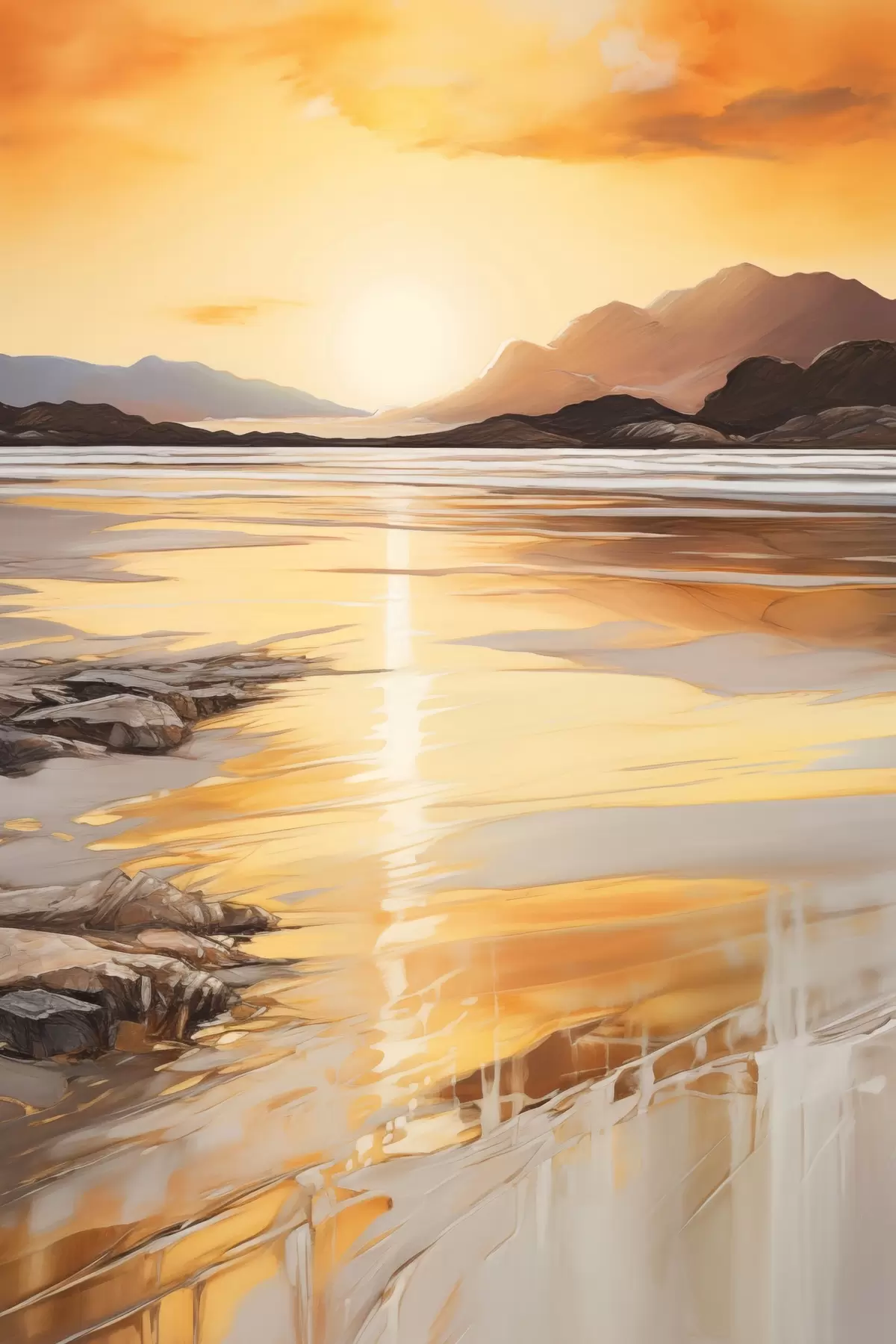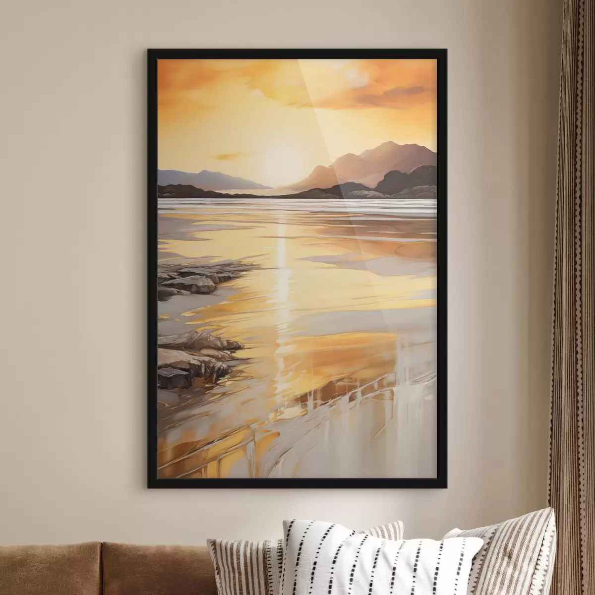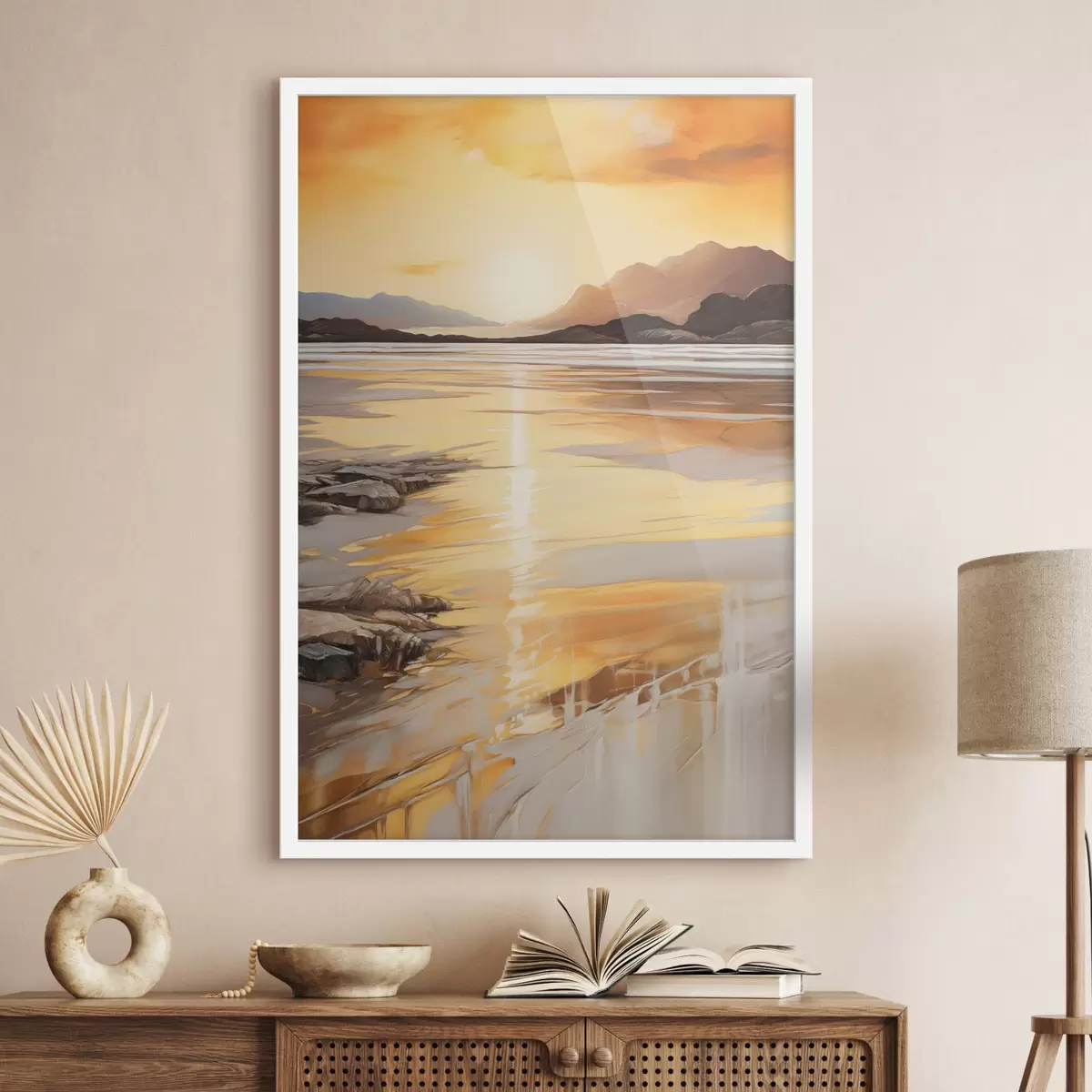 Poster Eine Landschaft mit einem Fluss und Bergen unter einem warmen orangefarbenen Himmel, Sonnenuntergang Nr f48756