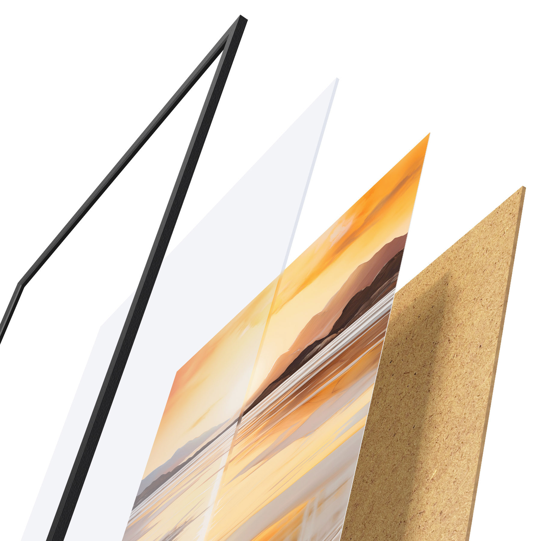 Das Poster besteht aus einem Rahmen, Plexiglas, einem gedruckten Bild und einer Rückwand aus Spanplatten. Dank der Halterungen auf der Rückseite kann das Poster sofort an die Wand gehängt werden.