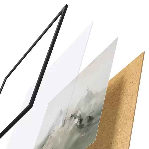 Das Poster besteht aus einem Rahmen, Plexiglas, einem gedruckten Bild und einer Rückwand aus Spanplatten. Dank der Halterungen auf der Rückseite kann das Poster sofort an die Wand gehängt werden.