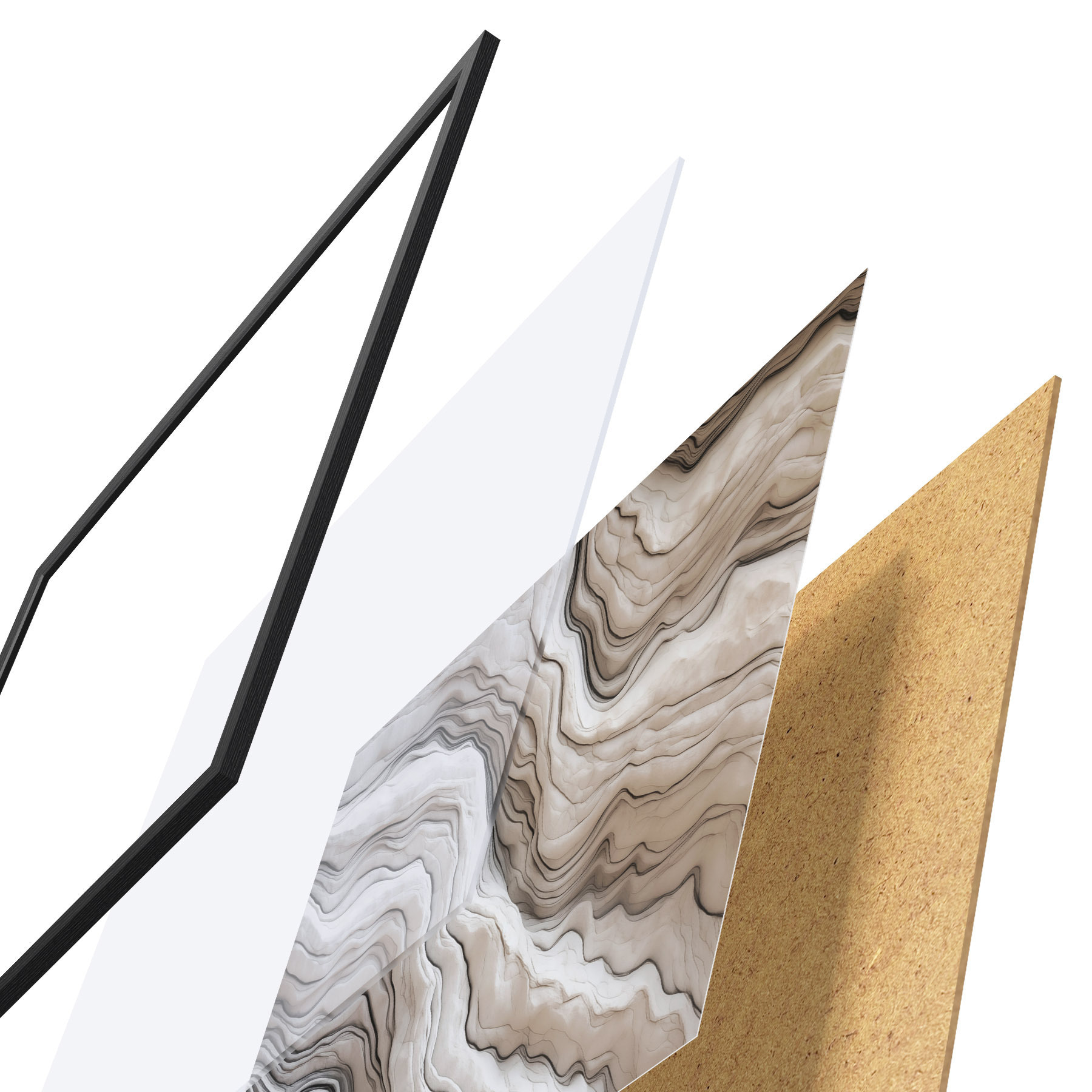 Das Poster besteht aus einem Rahmen, Plexiglas, einem gedruckten Bild und einer Rückwand aus Spanplatten. Dank der Halterungen auf der Rückseite kann das Poster sofort an die Wand gehängt werden.