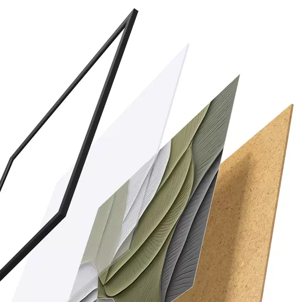 Das Poster besteht aus einem Rahmen, Plexiglas, einem gedruckten Bild und einer Rückwand aus Spanplatten. Dank der Halterungen auf der Rückseite kann das Poster sofort an die Wand gehängt werden.