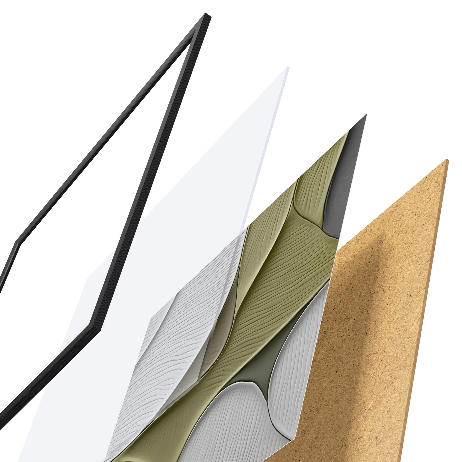 Das Poster besteht aus einem Rahmen, Plexiglas, einem gedruckten Bild und einer Rückwand aus Spanplatten. Dank der Halterungen auf der Rückseite kann das Poster sofort an die Wand gehängt werden.