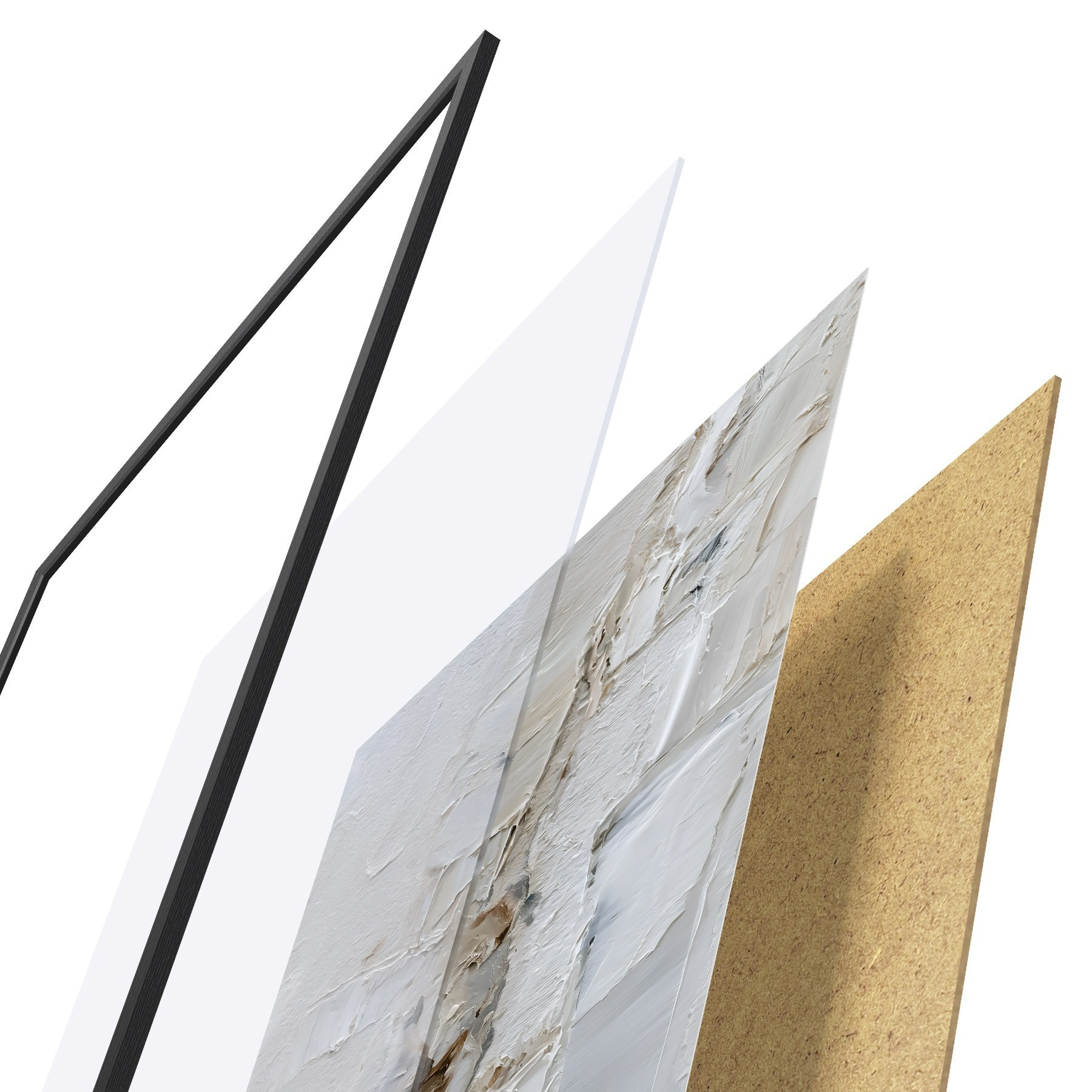 Das Poster besteht aus einem Rahmen, Plexiglas, einem gedruckten Bild und einer Rückwand aus Spanplatten. Dank der Halterungen auf der Rückseite kann das Poster sofort an die Wand gehängt werden.