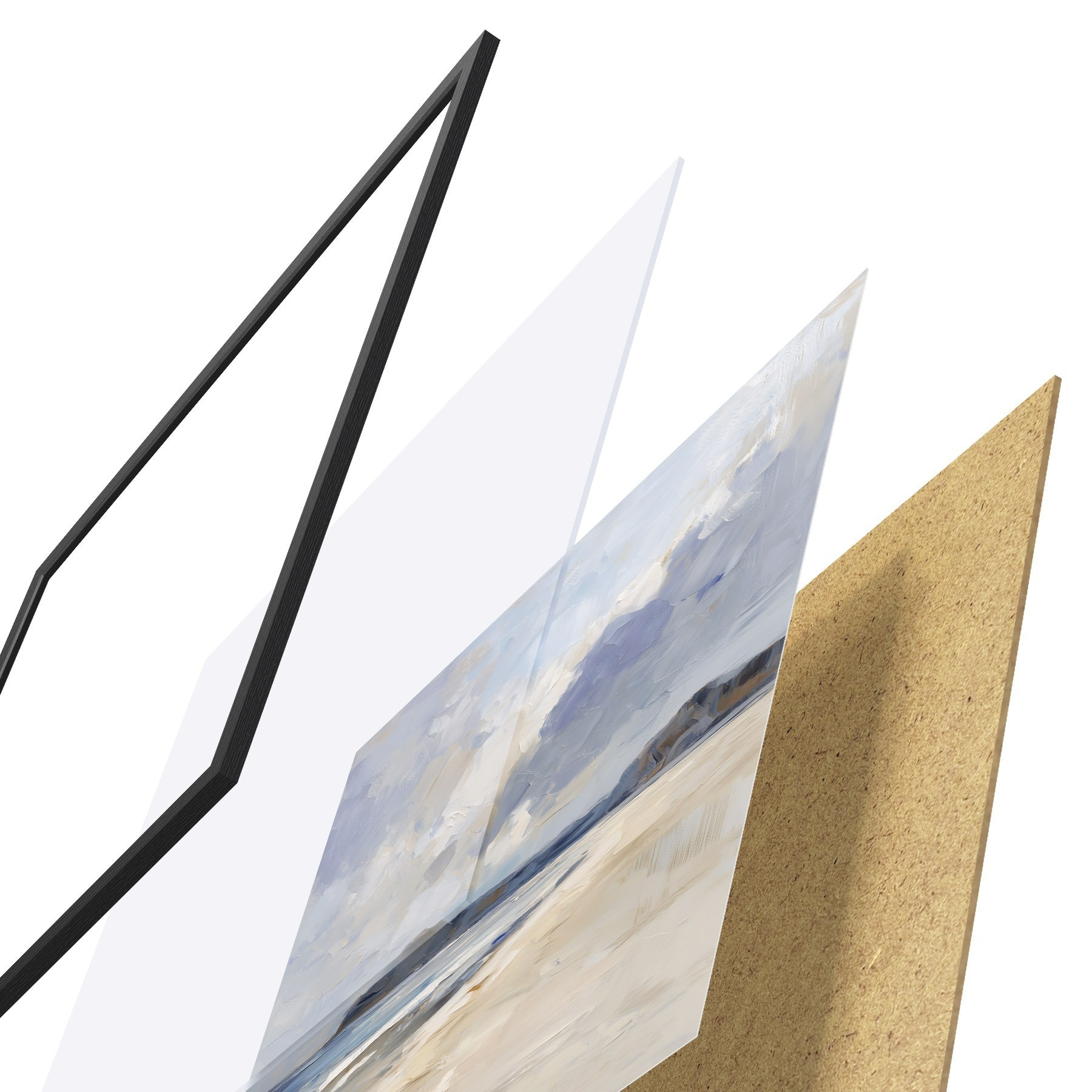 Das Poster besteht aus einem Rahmen, Plexiglas, einem gedruckten Bild und einer Rückwand aus Spanplatten. Dank der Halterungen auf der Rückseite kann das Poster sofort an die Wand gehängt werden.