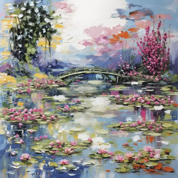 Poster Impressionistische Brücke über einen Teich mit Seerosen und Blumen f48807