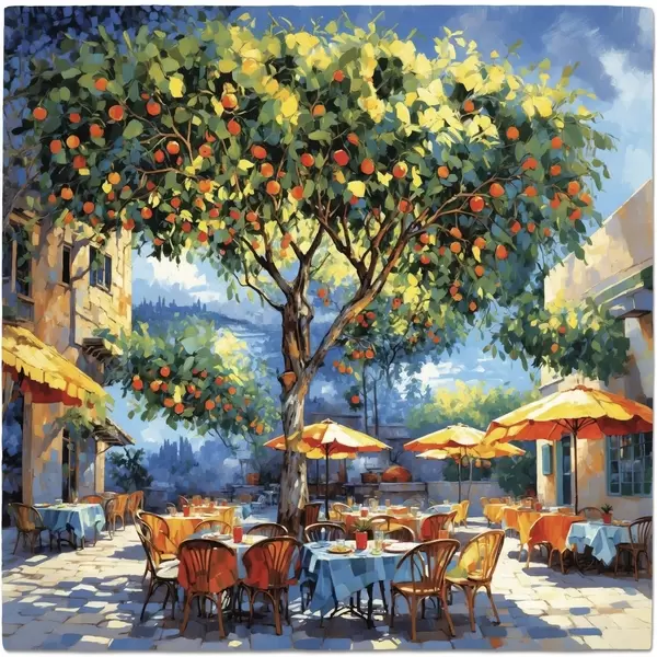 Poster Impressionistischer Café-Innenhof mit Baum und Sonnenschirmen f48811