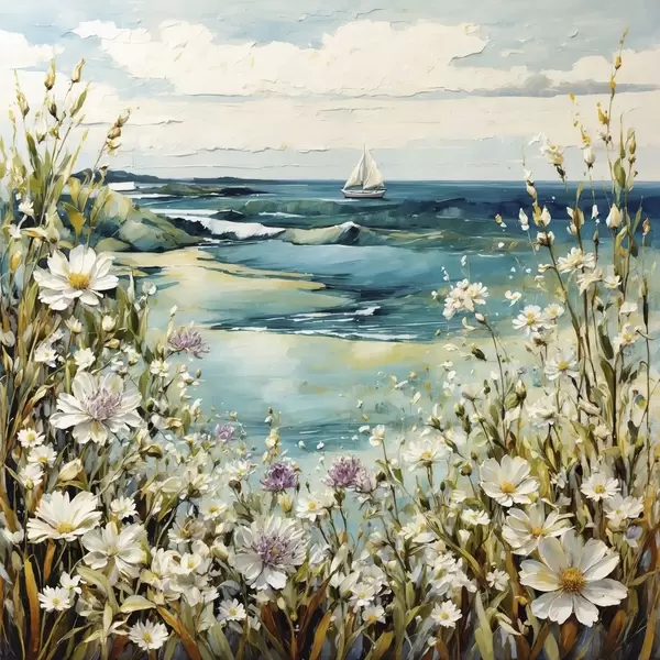 Poster Impressionistisches Küstenbild mit Segelboot und Blumen Nr f48813
