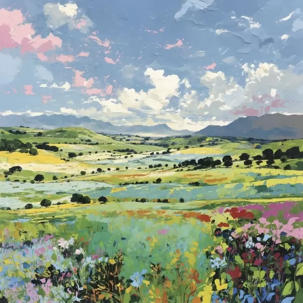 Poster Impressionismus: blühende Felder und Hügel unter dem Himmel Nr f48819