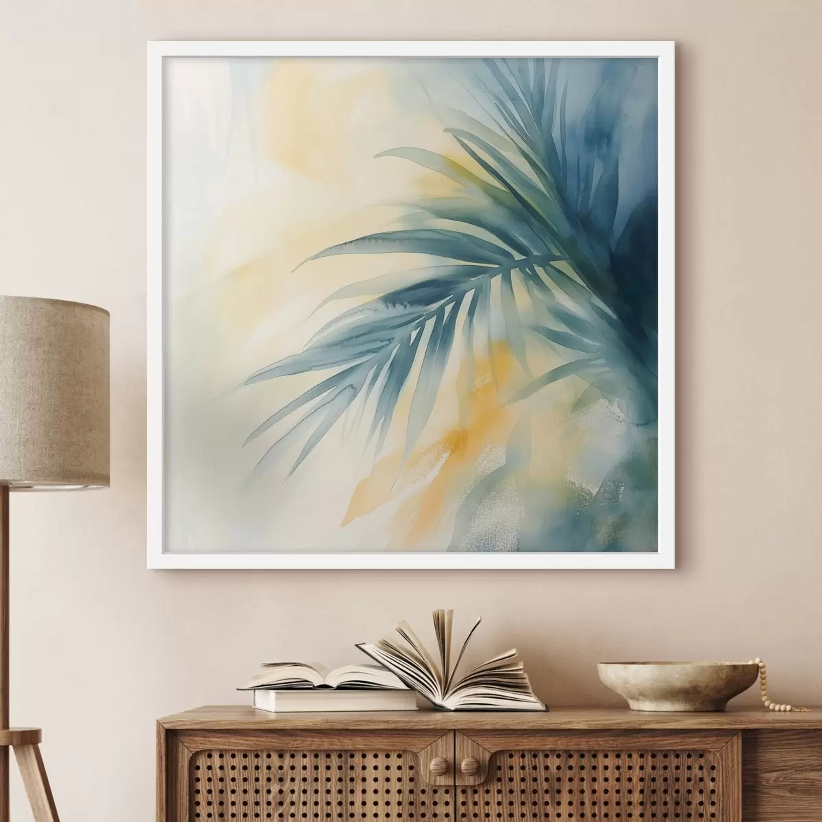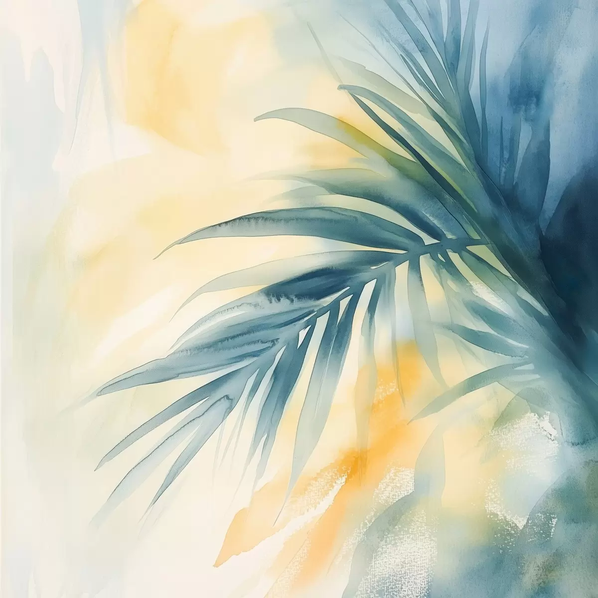 Poster Tropische Palmblätter in Blau- und Türkistönen vor einem Hintergrund aus warmen Aquarellflecken Nr f48849