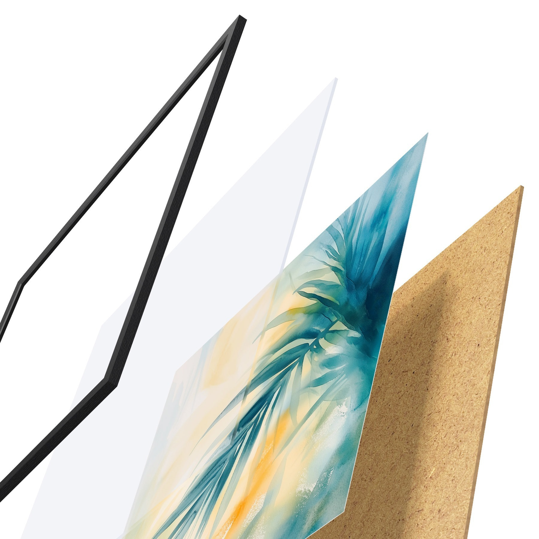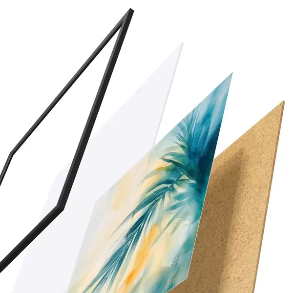 Das Poster besteht aus einem Rahmen, Plexiglas, einem gedruckten Bild und einer Rückwand aus Spanplatten. Dank der Halterungen auf der Rückseite kann das Poster sofort an die Wand gehängt werden.