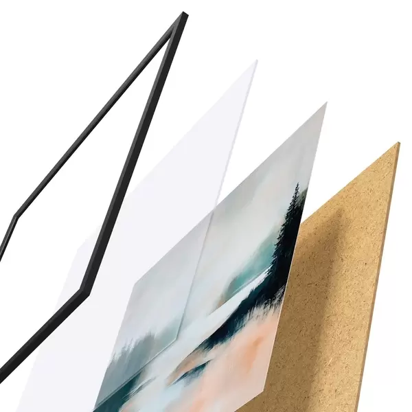 Das Poster besteht aus einem Rahmen, Plexiglas, einem gedruckten Bild und einer Rückwand aus Spanplatten. Dank der Halterungen auf der Rückseite kann das Poster sofort an die Wand gehängt werden.