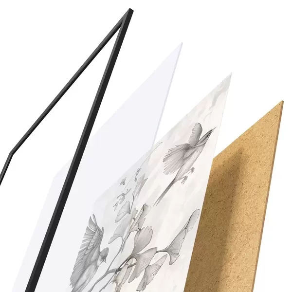 Das Poster besteht aus einem Rahmen, Plexiglas, einem gedruckten Bild und einer Rückwand aus Spanplatten. Dank der Halterungen auf der Rückseite kann das Poster sofort an die Wand gehängt werden.