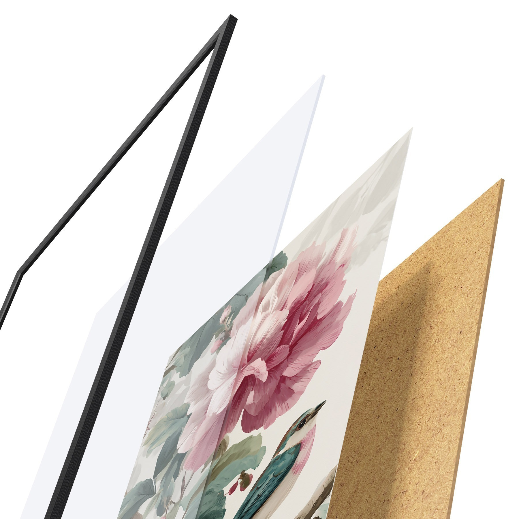 Das Poster besteht aus einem Rahmen, Plexiglas, einem gedruckten Bild und einer Rückwand aus Spanplatten. Dank der Halterungen auf der Rückseite kann das Poster sofort an die Wand gehängt werden.