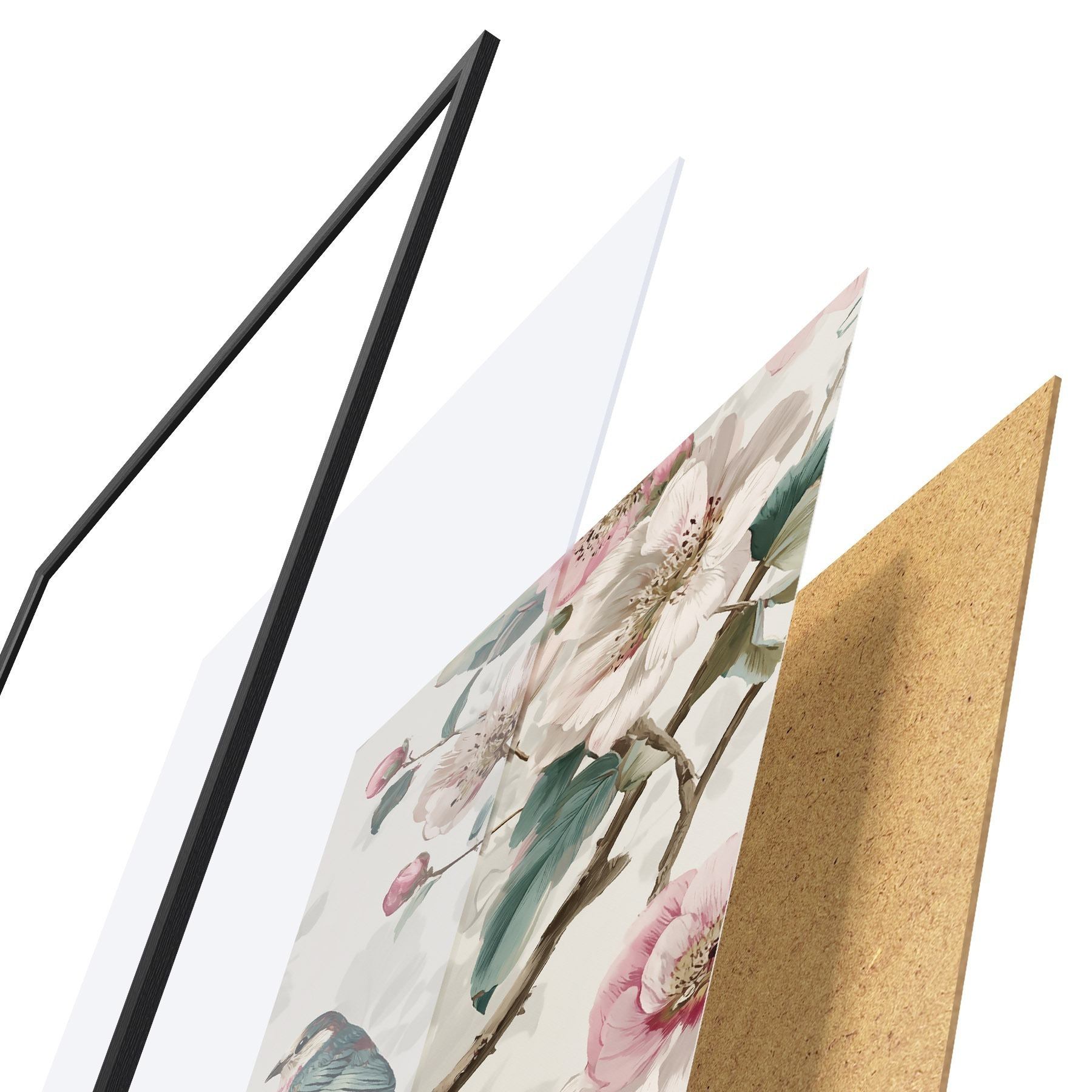 Das Poster besteht aus einem Rahmen, Plexiglas, einem gedruckten Bild und einer Rückwand aus Spanplatten. Dank der Halterungen auf der Rückseite kann das Poster sofort an die Wand gehängt werden.