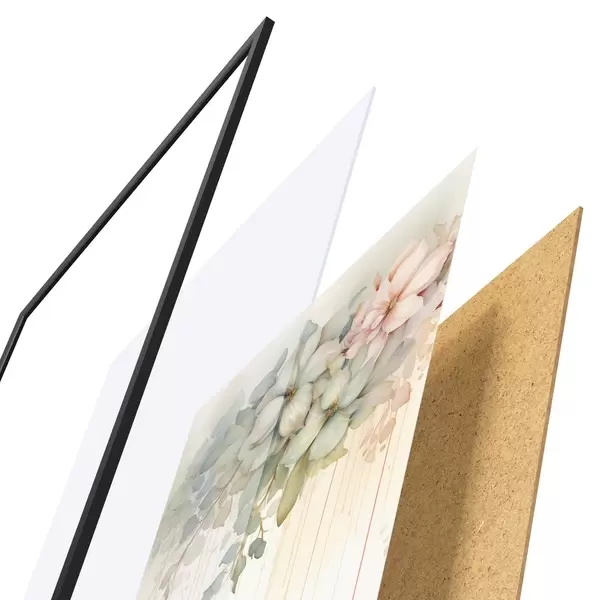 Das Poster besteht aus einem Rahmen, Plexiglas, einem gedruckten Bild und einer Rückwand aus Spanplatten. Dank der Halterungen auf der Rückseite kann das Poster sofort an die Wand gehängt werden.