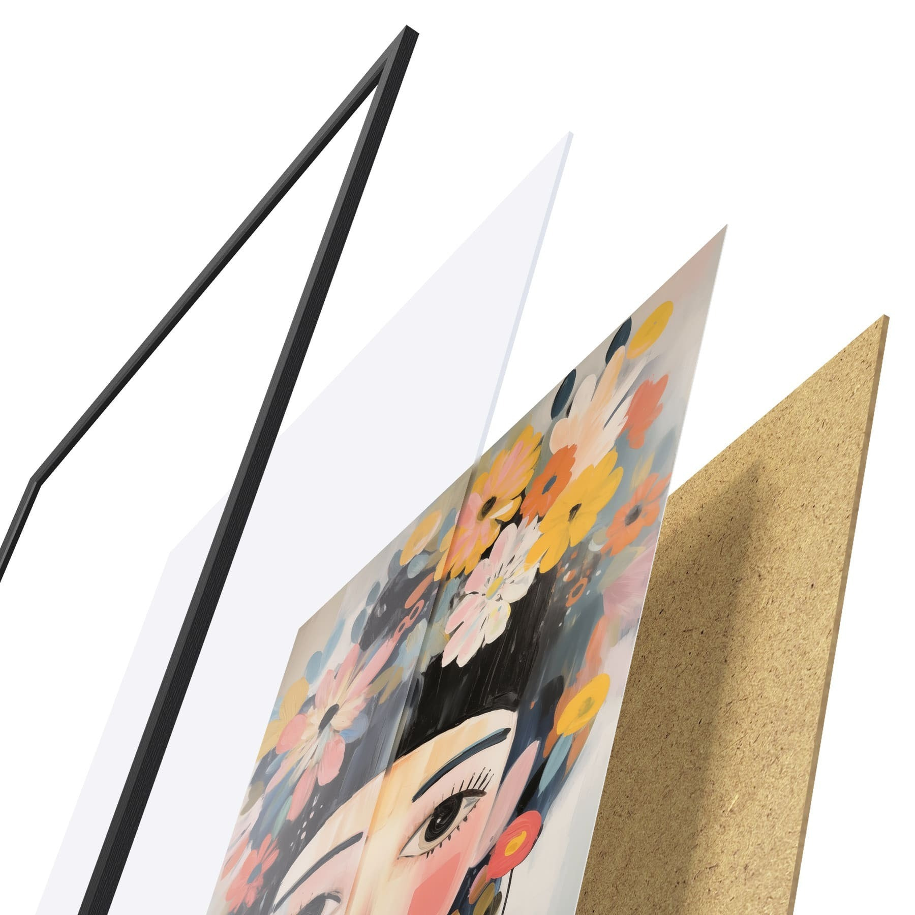 Das Poster besteht aus einem Rahmen, Plexiglas, einem gedruckten Bild und einer Rückwand aus Spanplatten. Dank der Halterungen auf der Rückseite kann das Poster sofort an die Wand gehängt werden.