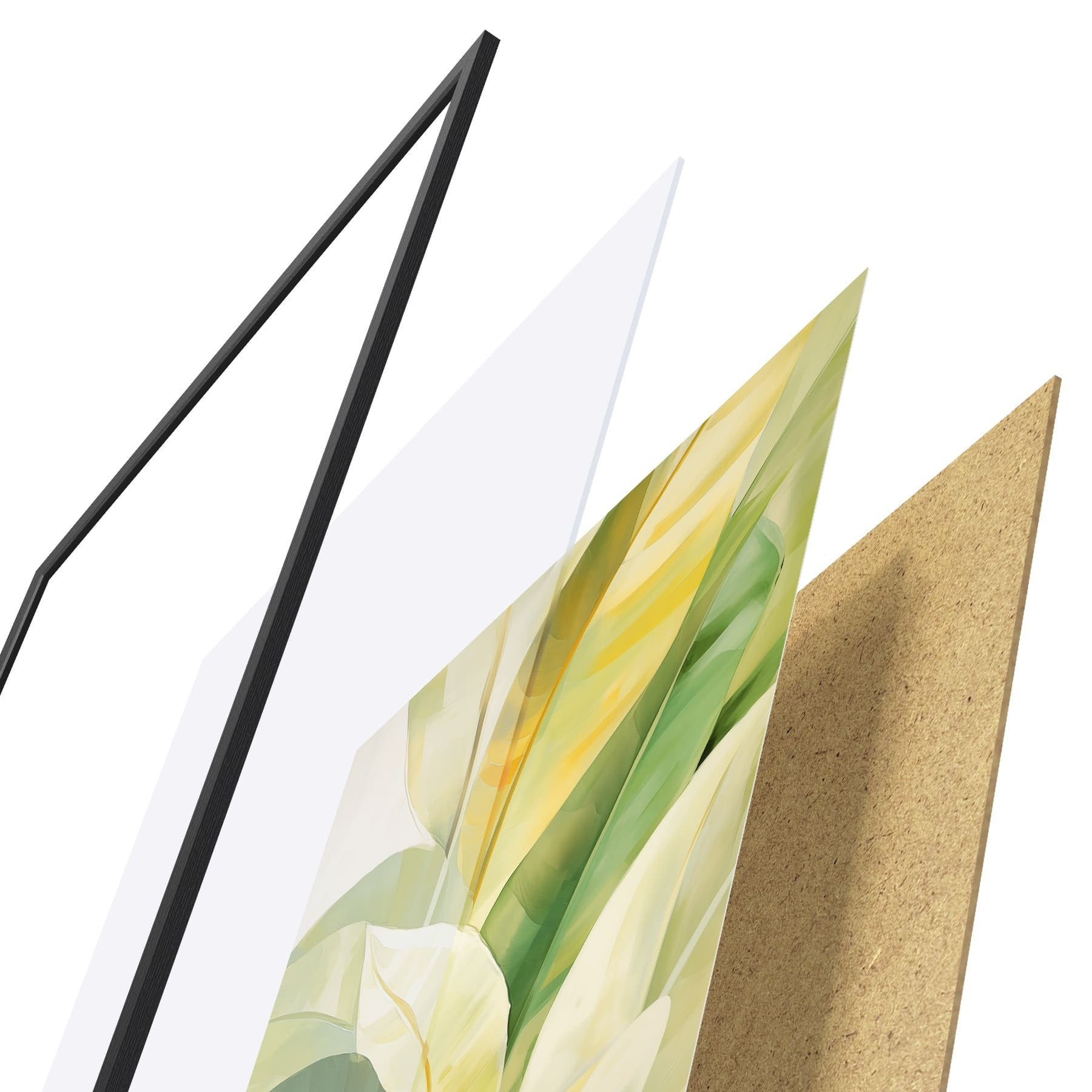 Das Poster besteht aus einem Rahmen, Plexiglas, einem gedruckten Bild und einer Rückwand aus Spanplatten. Dank der Halterungen auf der Rückseite kann das Poster sofort an die Wand gehängt werden.