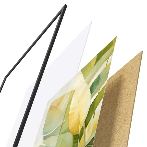 Das Poster besteht aus einem Rahmen, Plexiglas, einem gedruckten Bild und einer Rückwand aus Spanplatten. Dank der Halterungen auf der Rückseite kann das Poster sofort an die Wand gehängt werden.