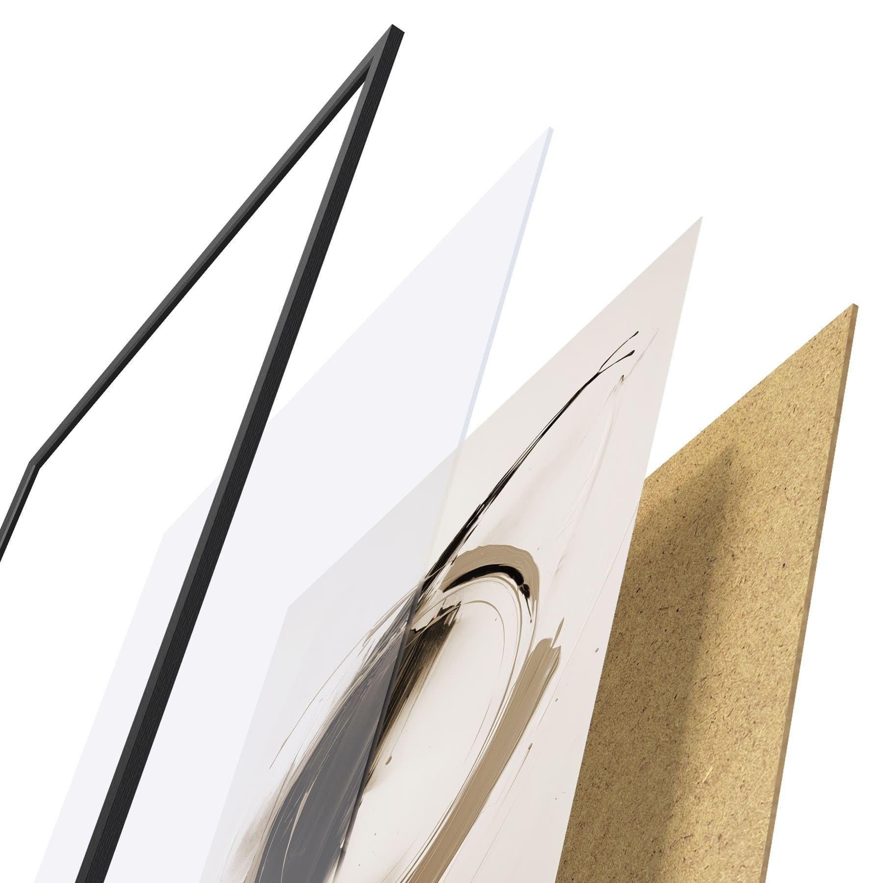 Das Poster besteht aus einem Rahmen, Plexiglas, einem gedruckten Bild und einer Rückwand aus Spanplatten. Dank der Halterungen auf der Rückseite kann das Poster sofort an die Wand gehängt werden.