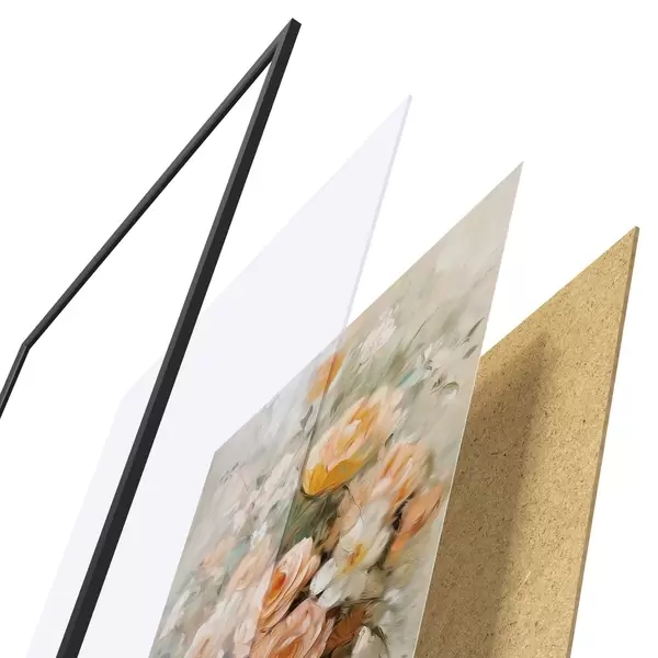 Das Poster besteht aus einem Rahmen, Plexiglas, einem gedruckten Bild und einer Rückwand aus Spanplatten. Dank der Halterungen auf der Rückseite kann das Poster sofort an die Wand gehängt werden.