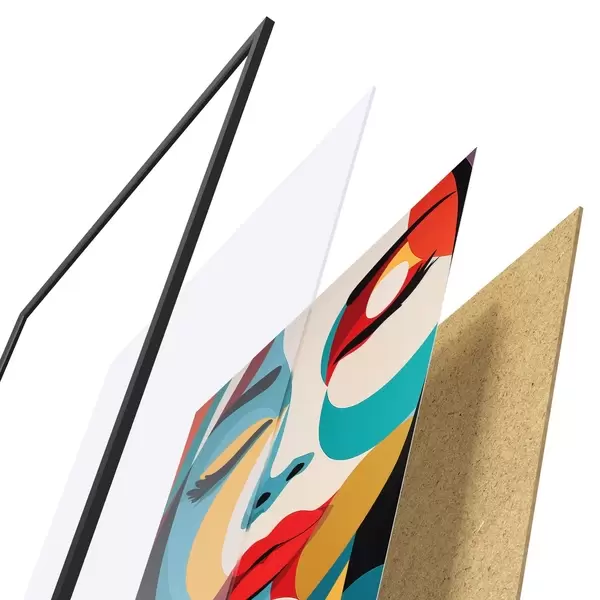 Das Poster besteht aus einem Rahmen, Plexiglas, einem gedruckten Bild und einer Rückwand aus Spanplatten. Dank der Halterungen auf der Rückseite kann das Poster sofort an die Wand gehängt werden.