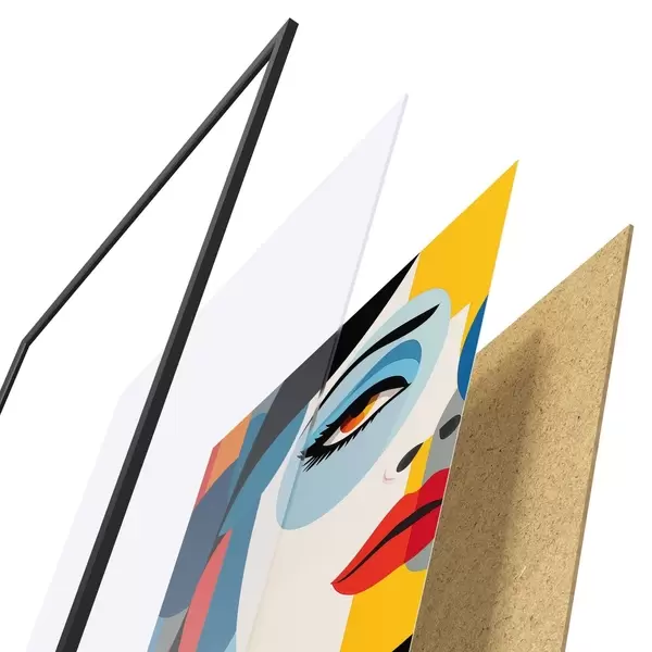 Das Poster besteht aus einem Rahmen, Plexiglas, einem gedruckten Bild und einer Rückwand aus Spanplatten. Dank der Halterungen auf der Rückseite kann das Poster sofort an die Wand gehängt werden.