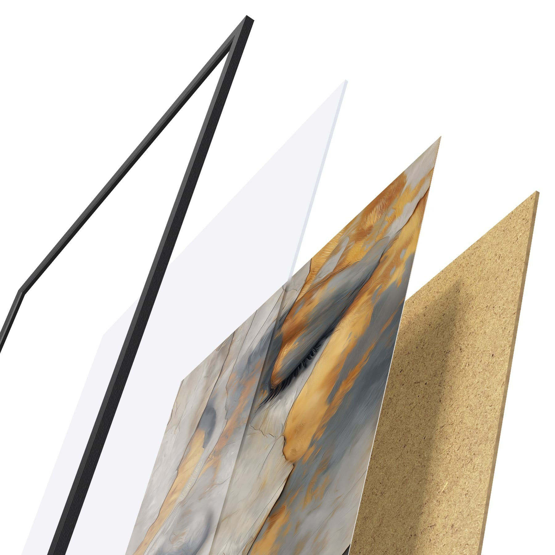 Das Poster besteht aus einem Rahmen, Plexiglas, einem gedruckten Bild und einer Rückwand aus Spanplatten. Dank der Halterungen auf der Rückseite kann das Poster sofort an die Wand gehängt werden.