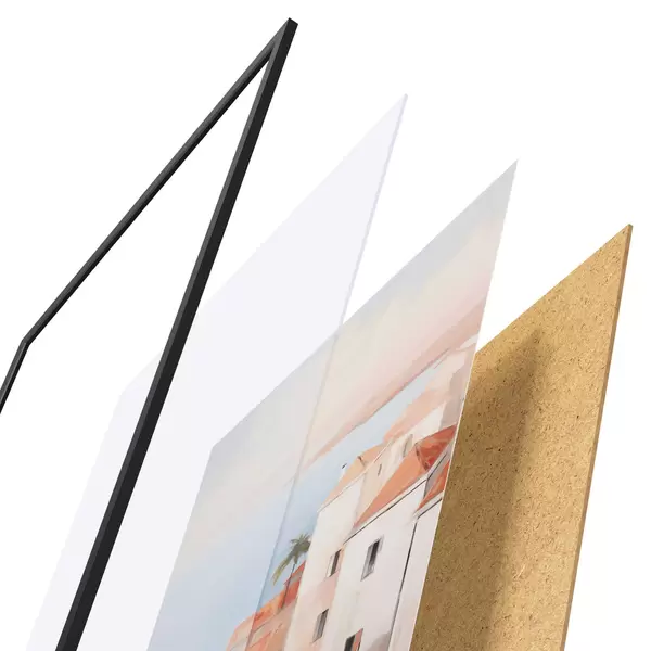 Das Poster besteht aus einem Rahmen, Plexiglas, einem gedruckten Bild und einer Rückwand aus Spanplatten. Dank der Halterungen auf der Rückseite kann das Poster sofort an die Wand gehängt werden.