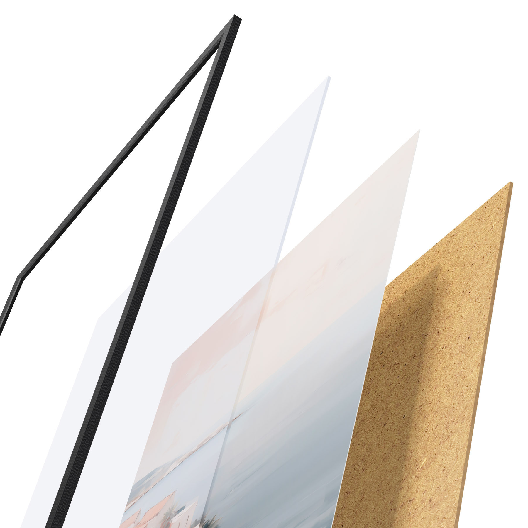 Das Poster besteht aus einem Rahmen, Plexiglas, einem gedruckten Bild und einer Rückwand aus Spanplatten. Dank der Halterungen auf der Rückseite kann das Poster sofort an die Wand gehängt werden.
