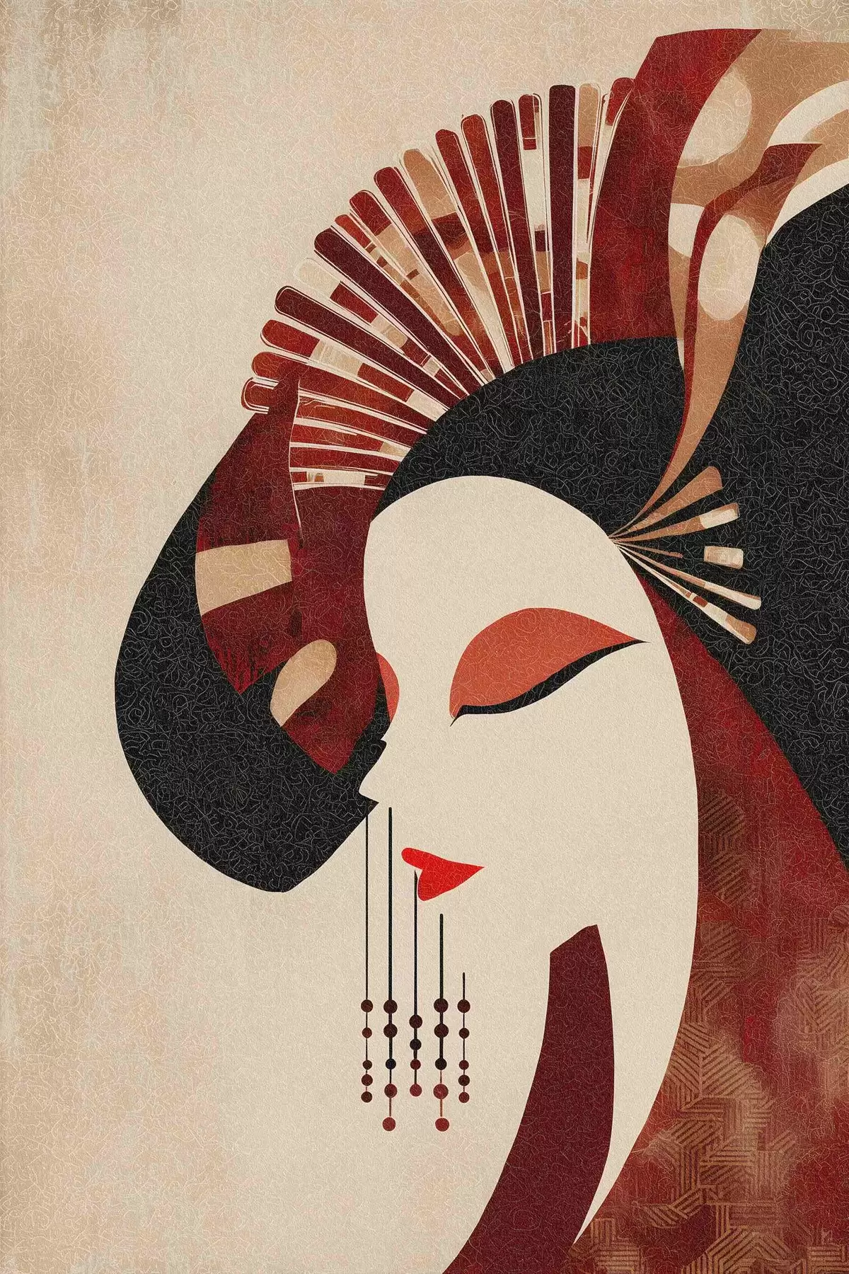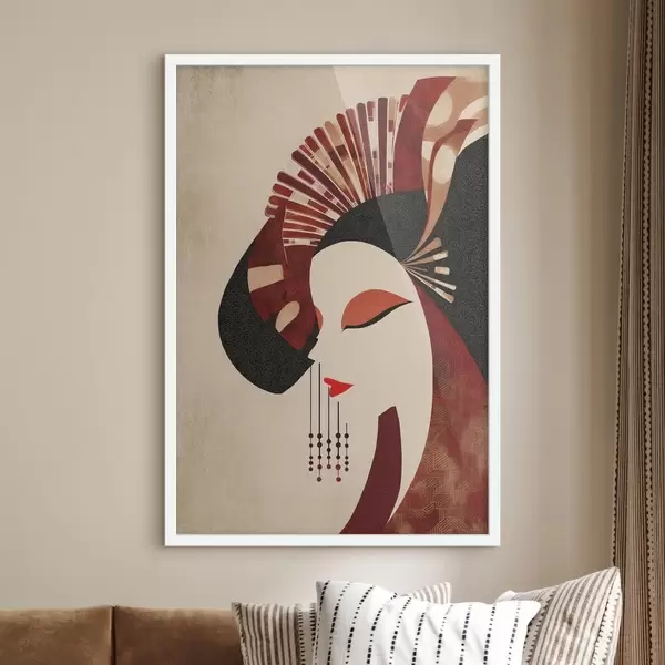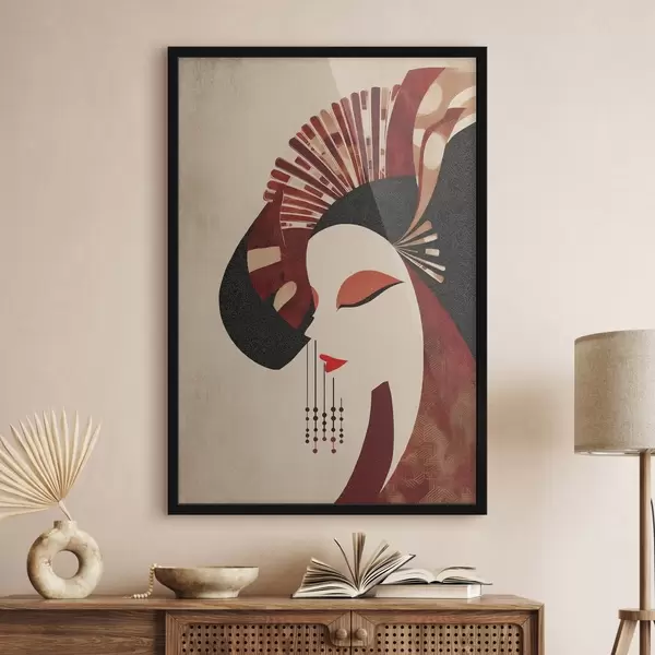 Poster stilisiertes Porträt einer Frau, inspiriert von japanischer und Art-déco-Ästhetik f48994