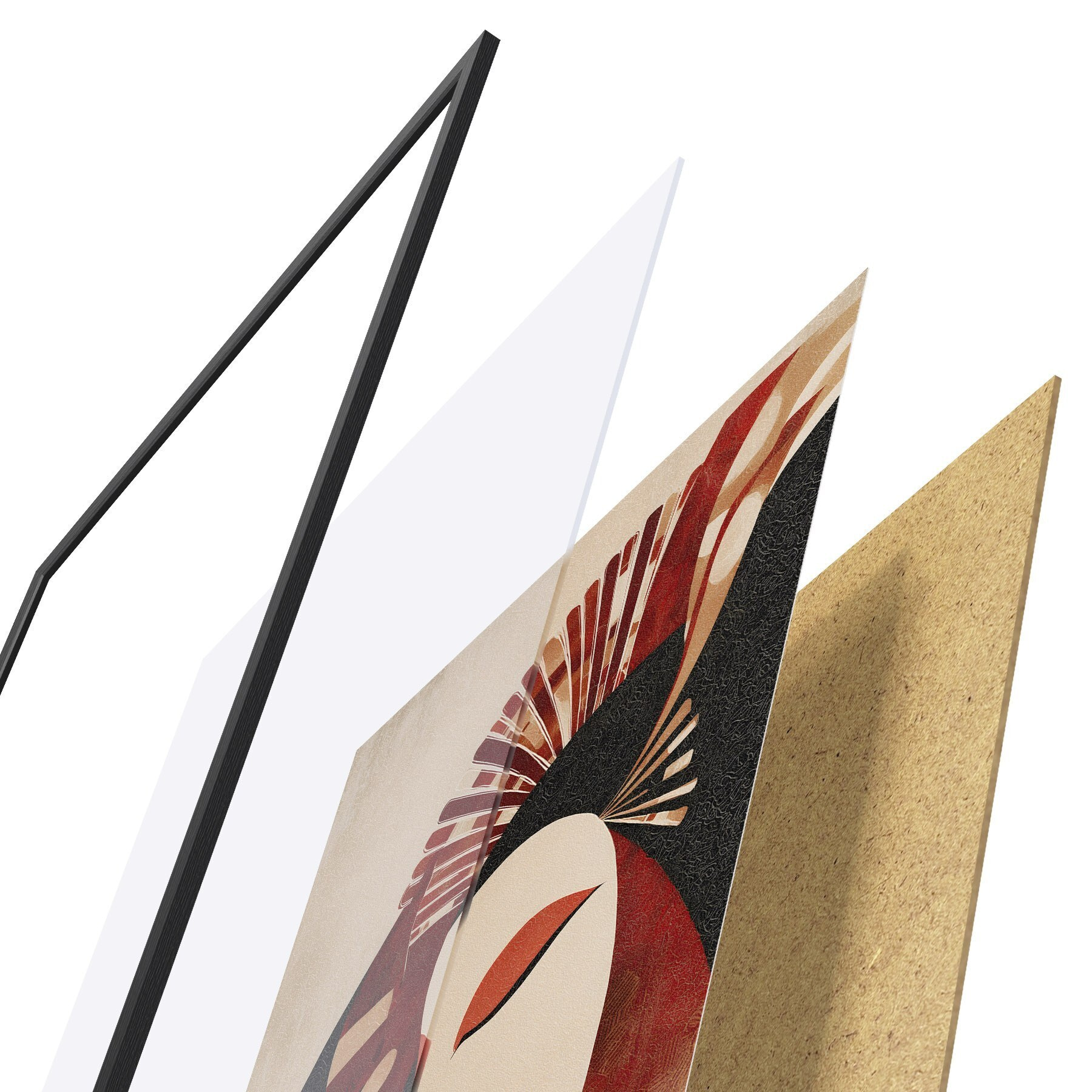 Das Poster besteht aus einem Rahmen, Plexiglas, einem gedruckten Bild und einer Rückwand aus Spanplatten. Dank der Halterungen auf der Rückseite kann das Poster sofort an die Wand gehängt werden.