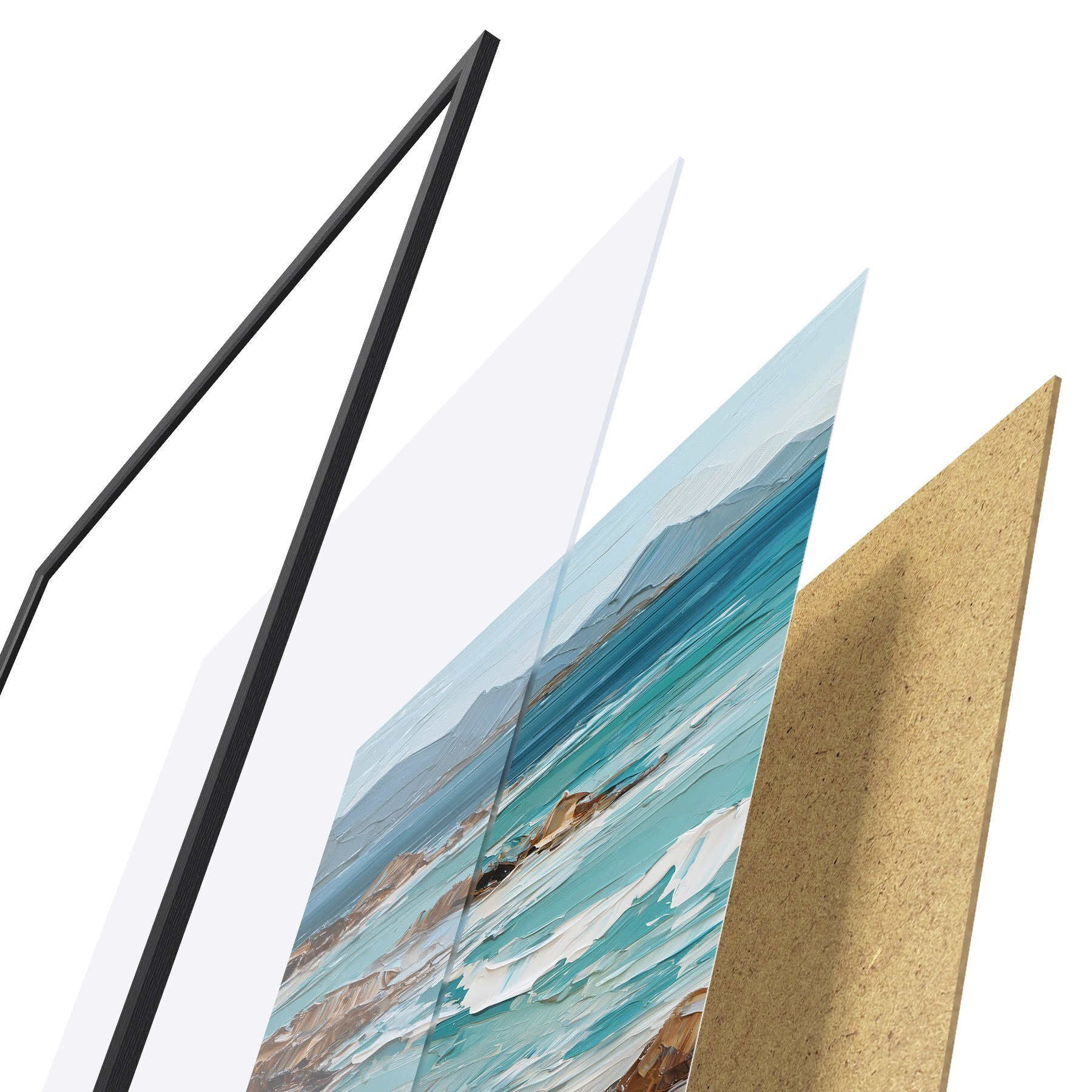 Das Poster besteht aus einem Rahmen, Plexiglas, einem gedruckten Bild und einer Rückwand aus Spanplatten. Dank der Halterungen auf der Rückseite kann das Poster sofort an die Wand gehängt werden.