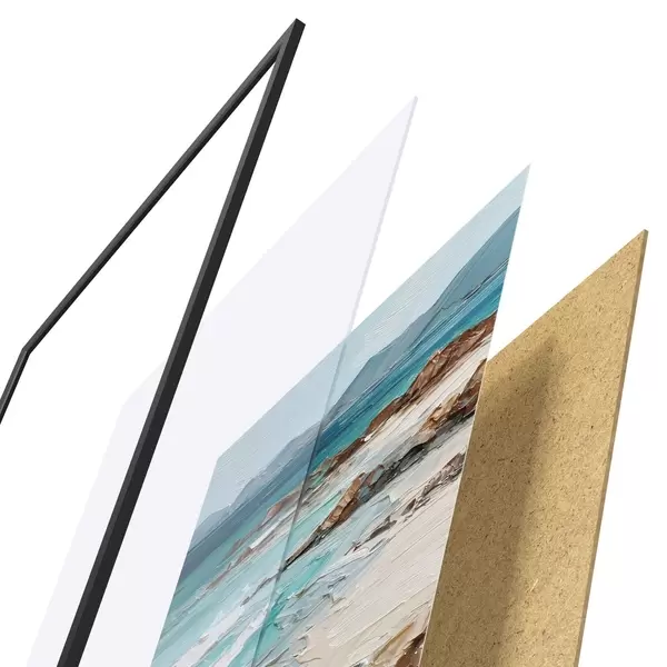 Das Poster besteht aus einem Rahmen, Plexiglas, einem gedruckten Bild und einer Rückwand aus Spanplatten. Dank der Halterungen auf der Rückseite kann das Poster sofort an die Wand gehängt werden.