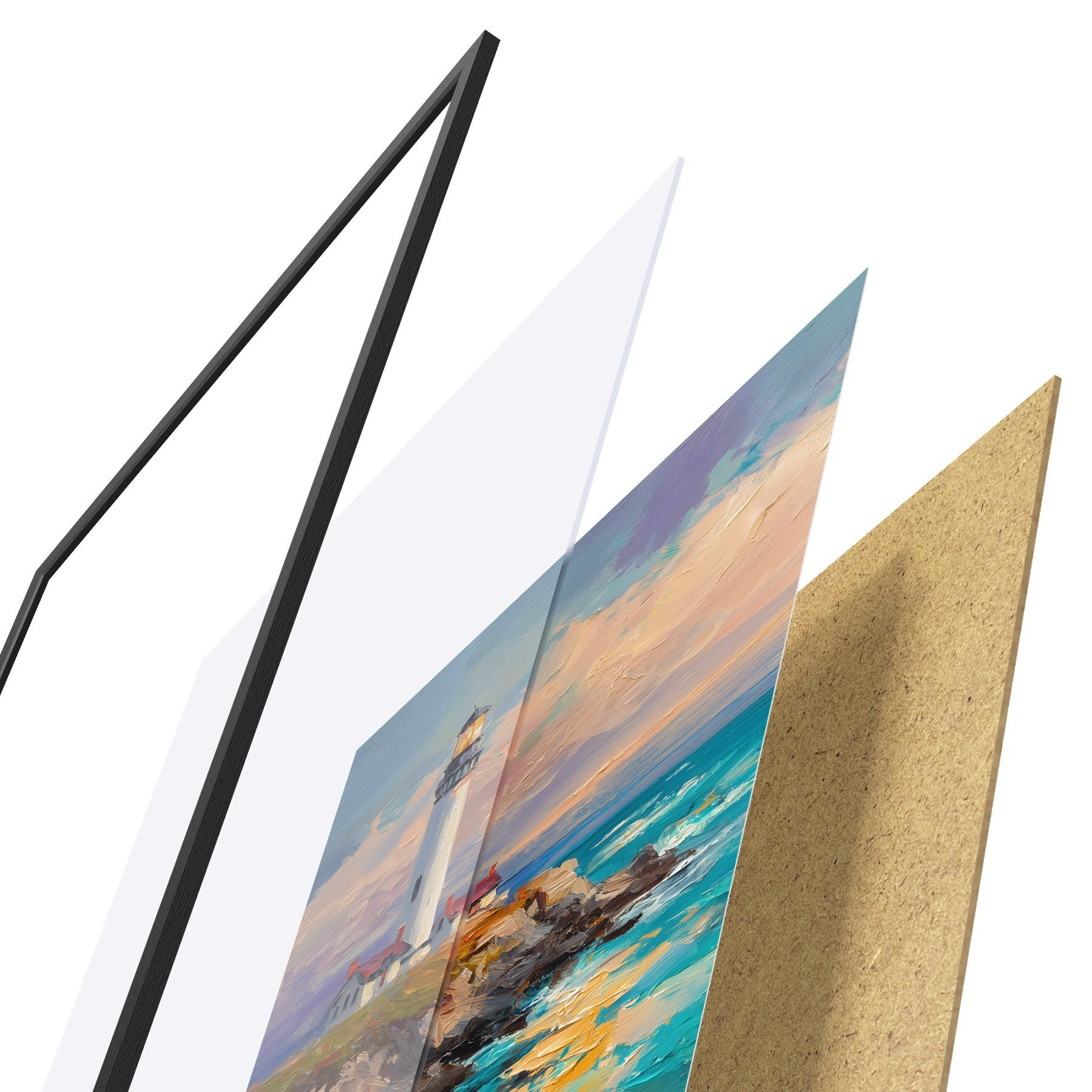 Das Poster besteht aus einem Rahmen, Plexiglas, einem gedruckten Bild und einer Rückwand aus Spanplatten. Dank der Halterungen auf der Rückseite kann das Poster sofort an die Wand gehängt werden.