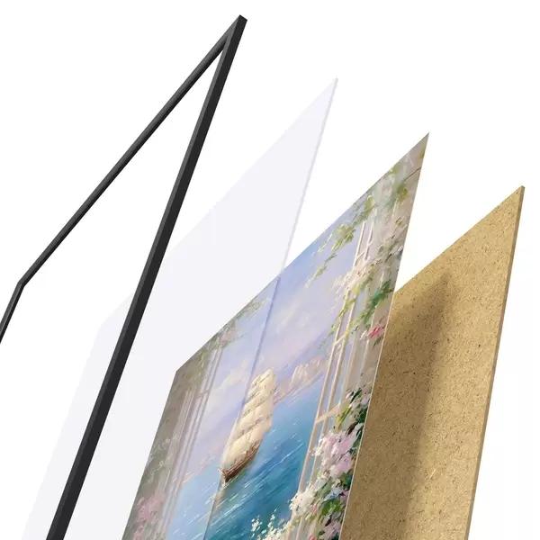 Das Poster besteht aus einem Rahmen, Plexiglas, einem gedruckten Bild und einer Rückwand aus Spanplatten. Dank der Halterungen auf der Rückseite kann das Poster sofort an die Wand gehängt werden.