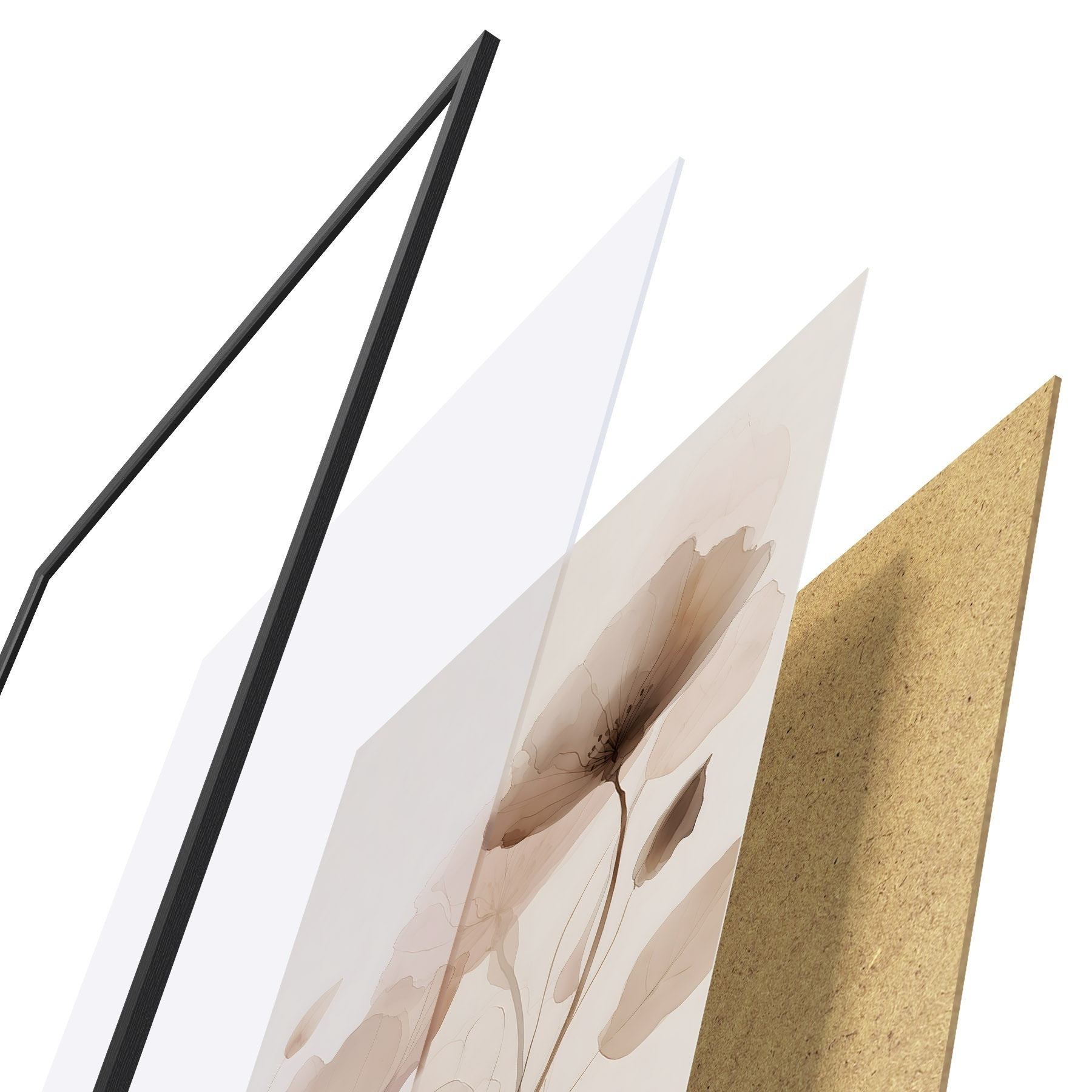 Das Poster besteht aus einem Rahmen, Plexiglas, einem gedruckten Bild und einer Rückwand aus Spanplatten. Dank der Halterungen auf der Rückseite kann das Poster sofort an die Wand gehängt werden.