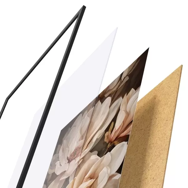 Das Poster besteht aus einem Rahmen, Plexiglas, einem gedruckten Bild und einer Rückwand aus Spanplatten. Dank der Halterungen auf der Rückseite kann das Poster sofort an die Wand gehängt werden.