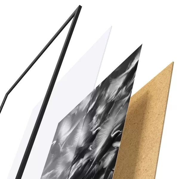 Das Poster besteht aus einem Rahmen, Plexiglas, einem gedruckten Bild und einer Rückwand aus Spanplatten. Dank der Halterungen auf der Rückseite kann das Poster sofort an die Wand gehängt werden.