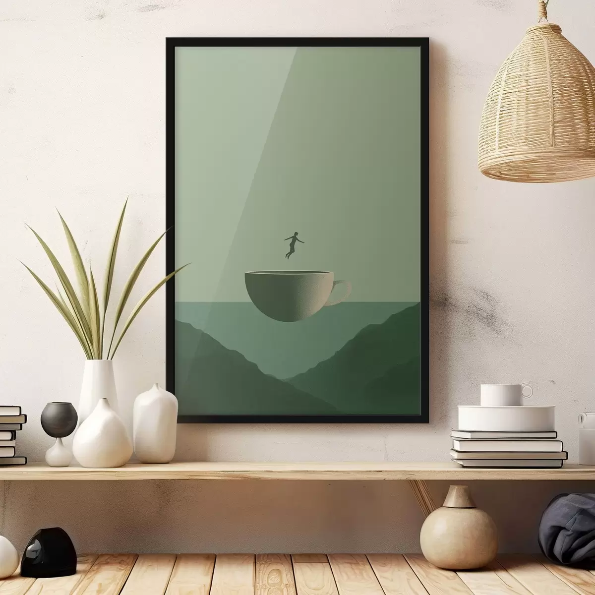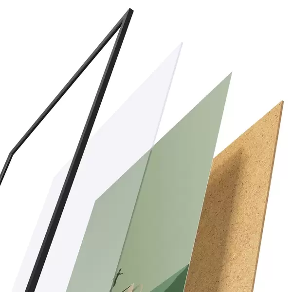 Das Poster besteht aus einem Rahmen, Plexiglas, einem gedruckten Bild und einer Rückwand aus Spanplatten. Dank der Halterungen auf der Rückseite kann das Poster sofort an die Wand gehängt werden.