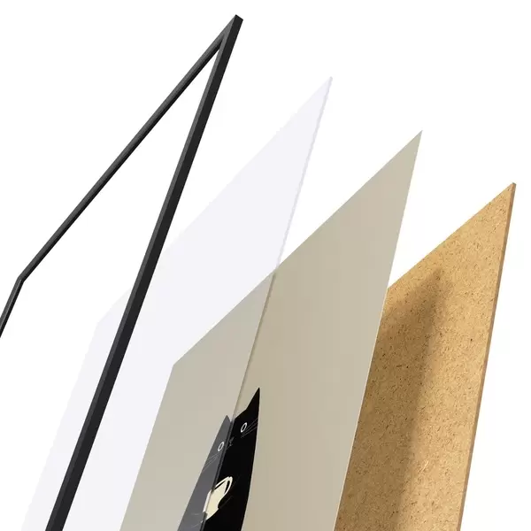 Das Poster besteht aus einem Rahmen, Plexiglas, einem gedruckten Bild und einer Rückwand aus Spanplatten. Dank der Halterungen auf der Rückseite kann das Poster sofort an die Wand gehängt werden.