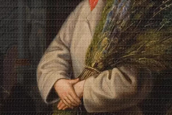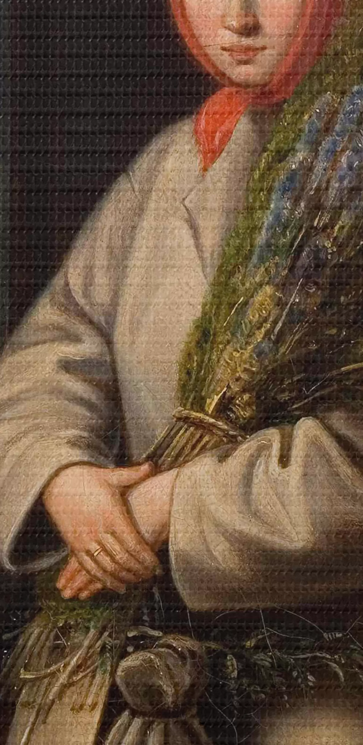 Das Bild kann vorsichtig mit einem trockenen, weichen Tuch oder Schwamm abgewischt werden; es wird nicht empfohlen, feuchte Produkte zu verwenden. Die Verwendung eines feuchten Schwamms ist nur zulässig, wenn das Bild lackiert wurde.