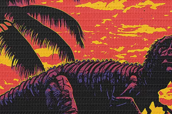 Runde Wandbilder Dinosaurier bei Sonnenuntergang in den Palmen r33894