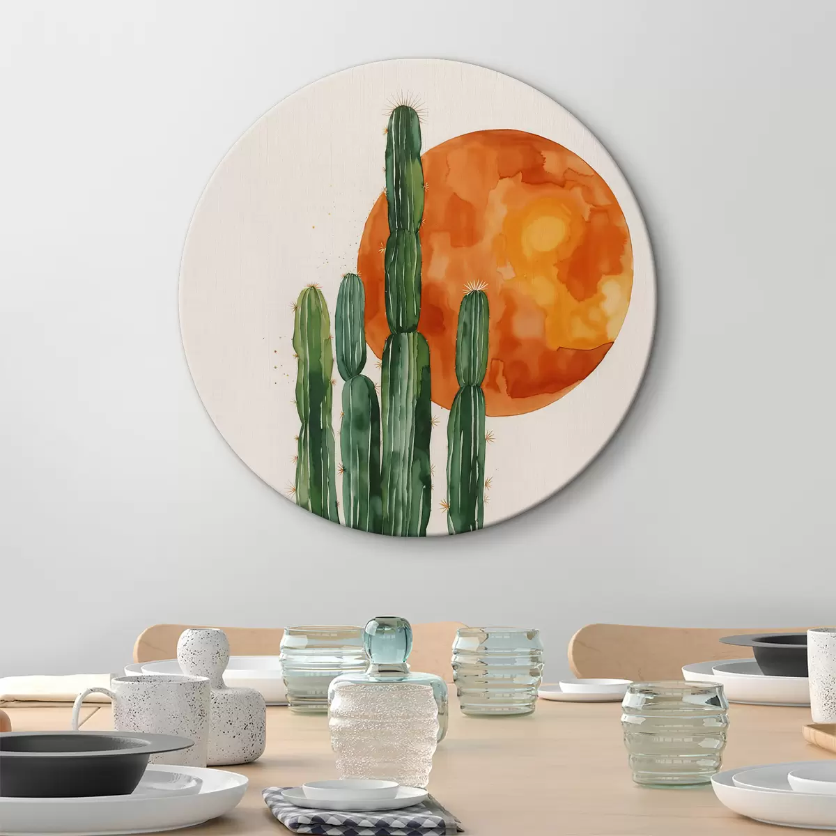 Runde Wandbilder Kaktus in der Wüste vor dem Hintergrund der Sonne in Aquarell Nr r36269