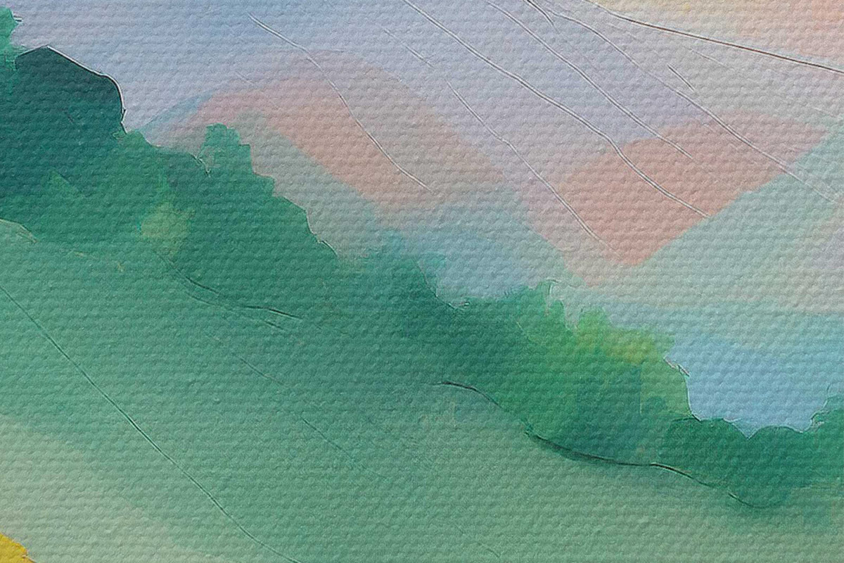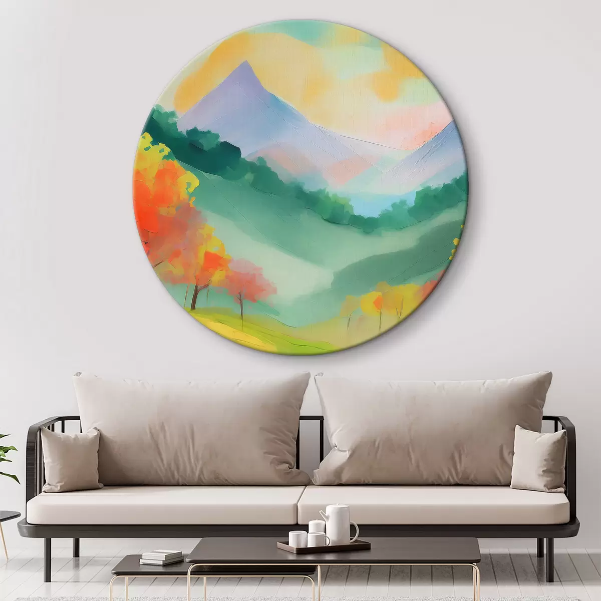 Runde Wandbilder Acrylzeichnung Naturlandschaft, Sonnenuntergang Farben, Berge, Bäume, Wiese Nr r36505